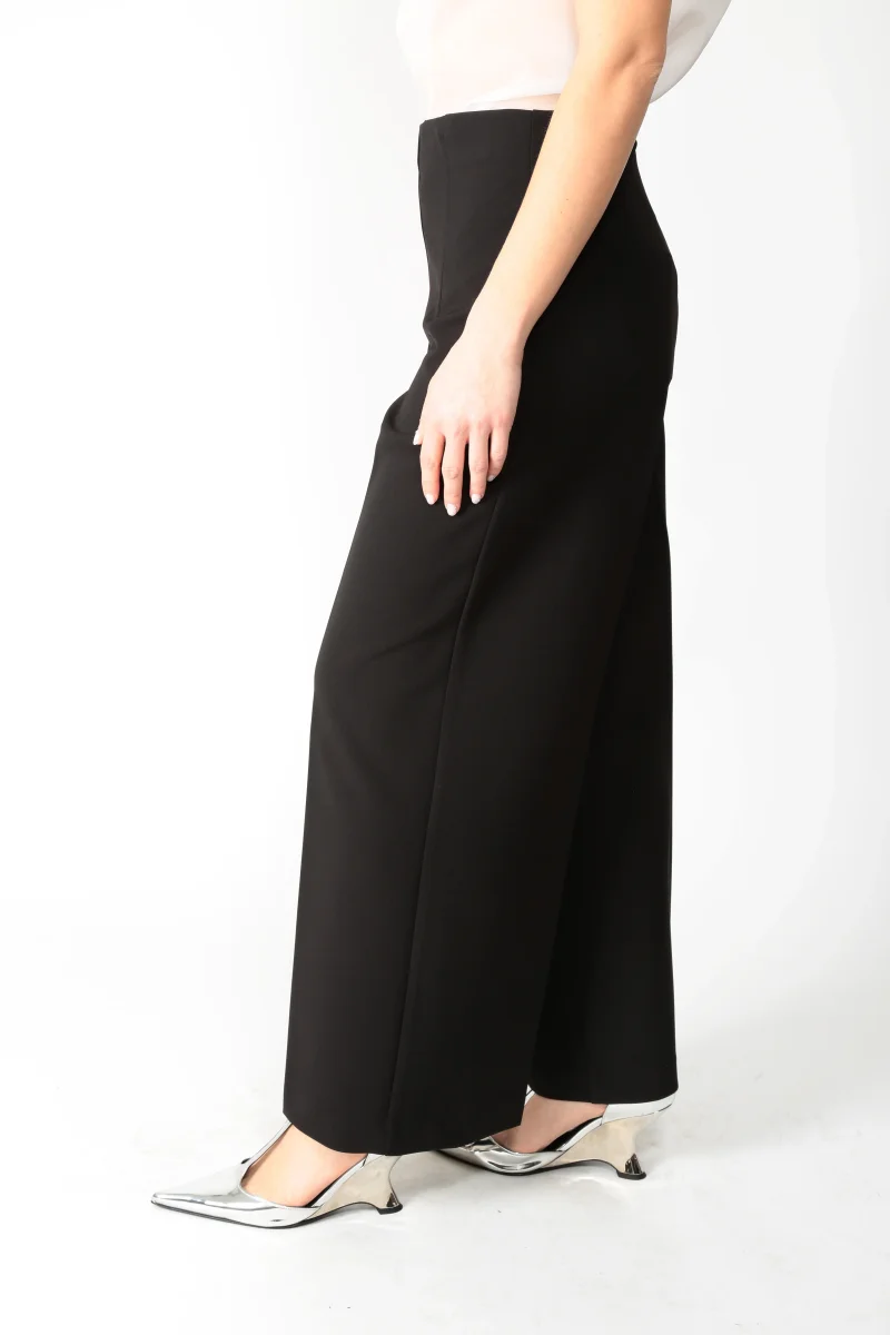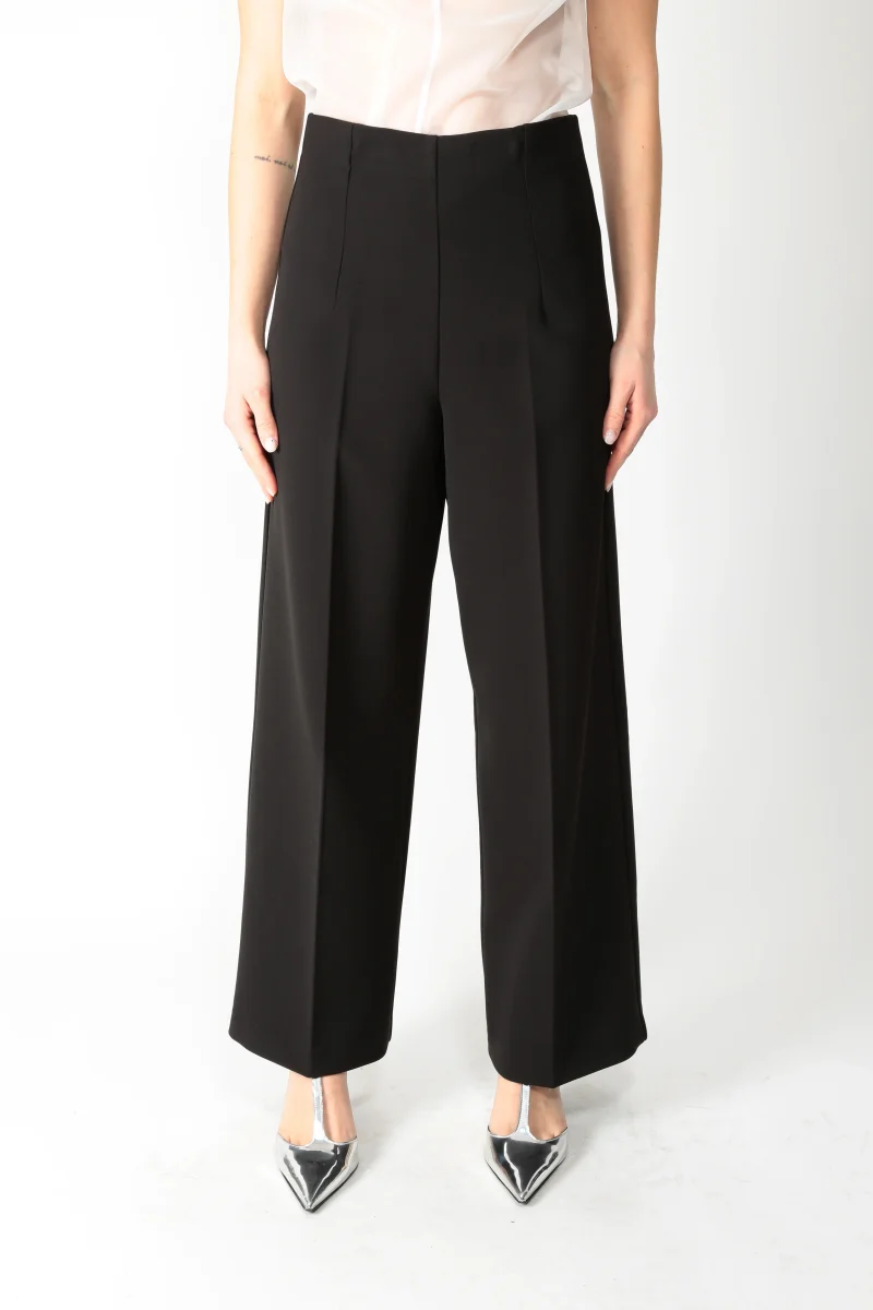 Pantalone dalla linea morbida. Vita alta. Chiusura con zip nascosta nel centro dietro. Gamba ampia e lunga con piega stirata davanti e dietro. Disponibile anche nel colore latte.