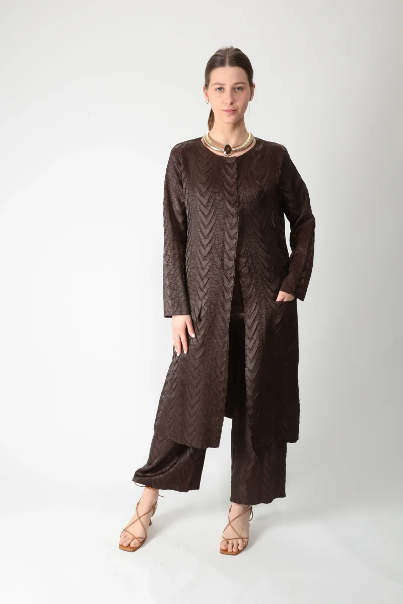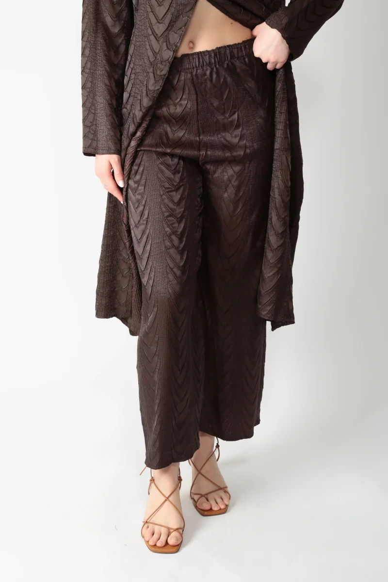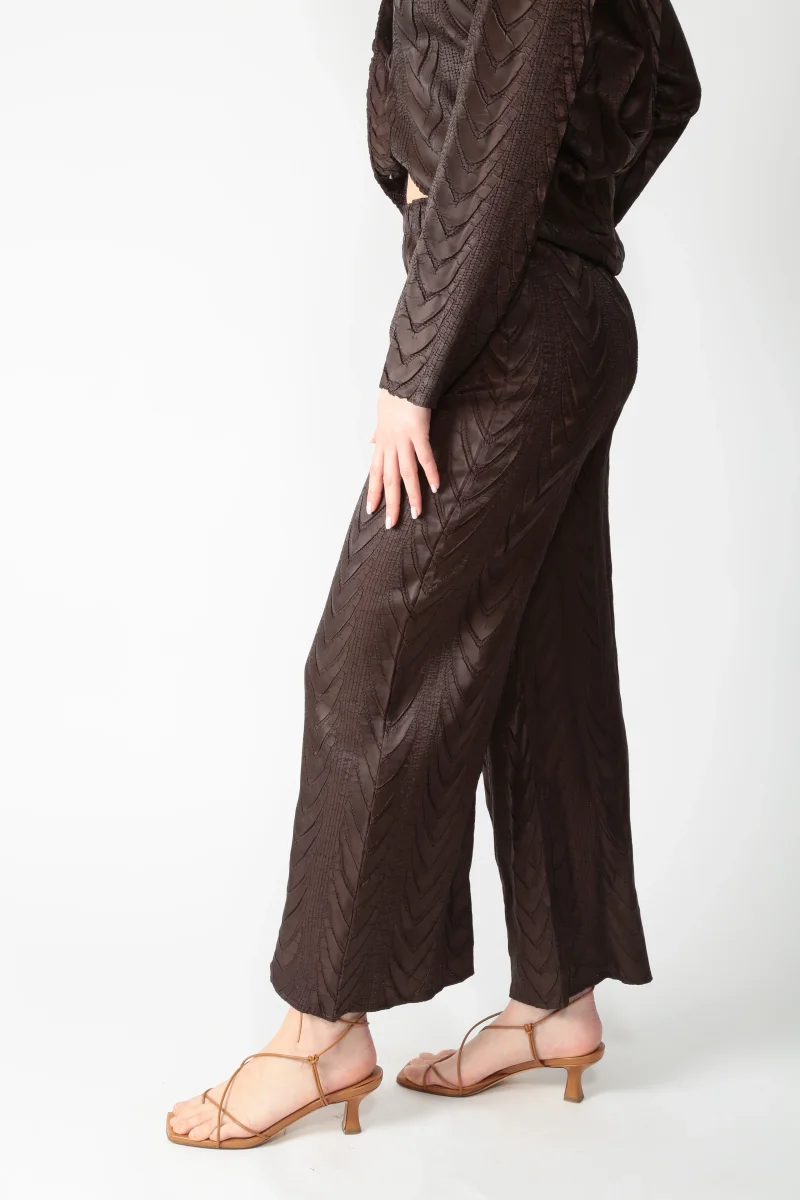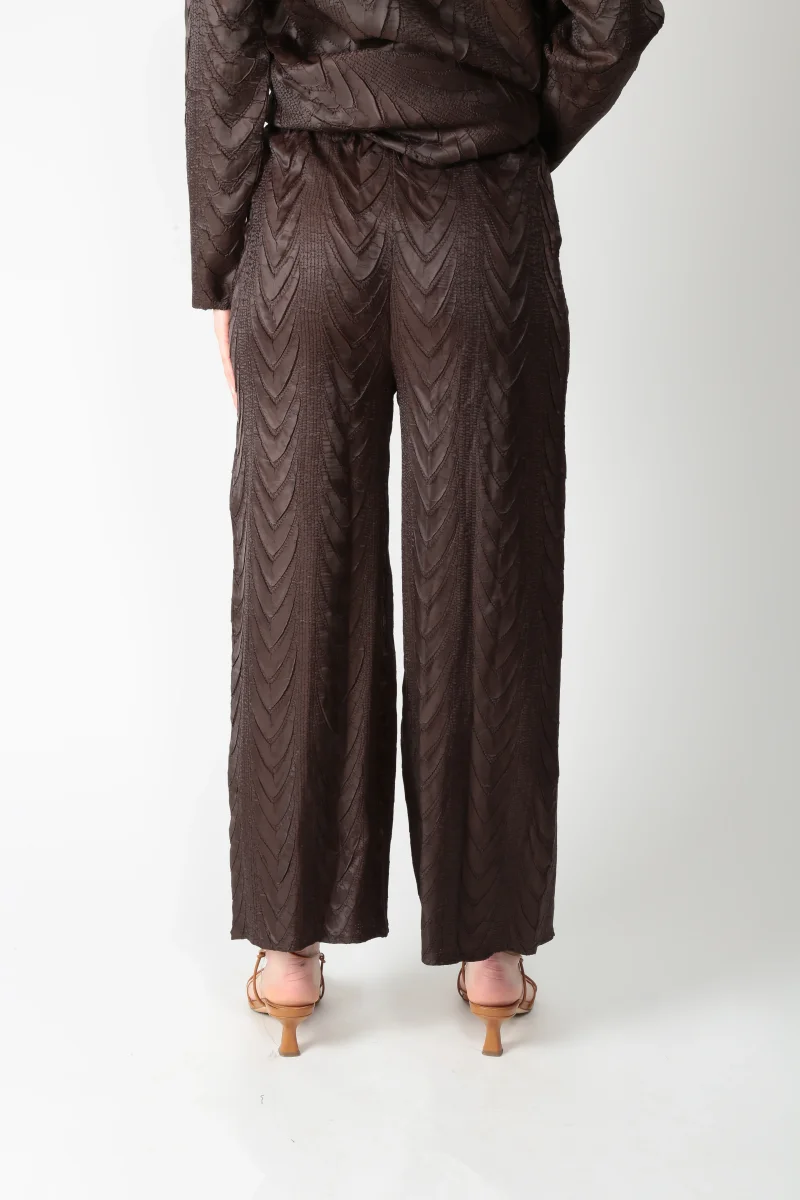 Pantalone ampio con effetto pelle di serpente. Elastico in vita. Gamba morbida e lunga. Possibilità di abbinarlo al suo cardigan – art. M6PY03 –