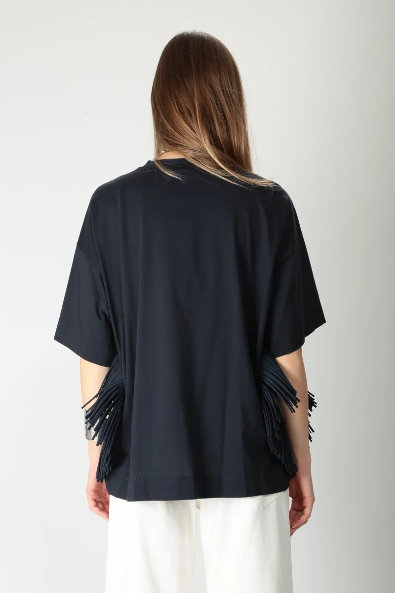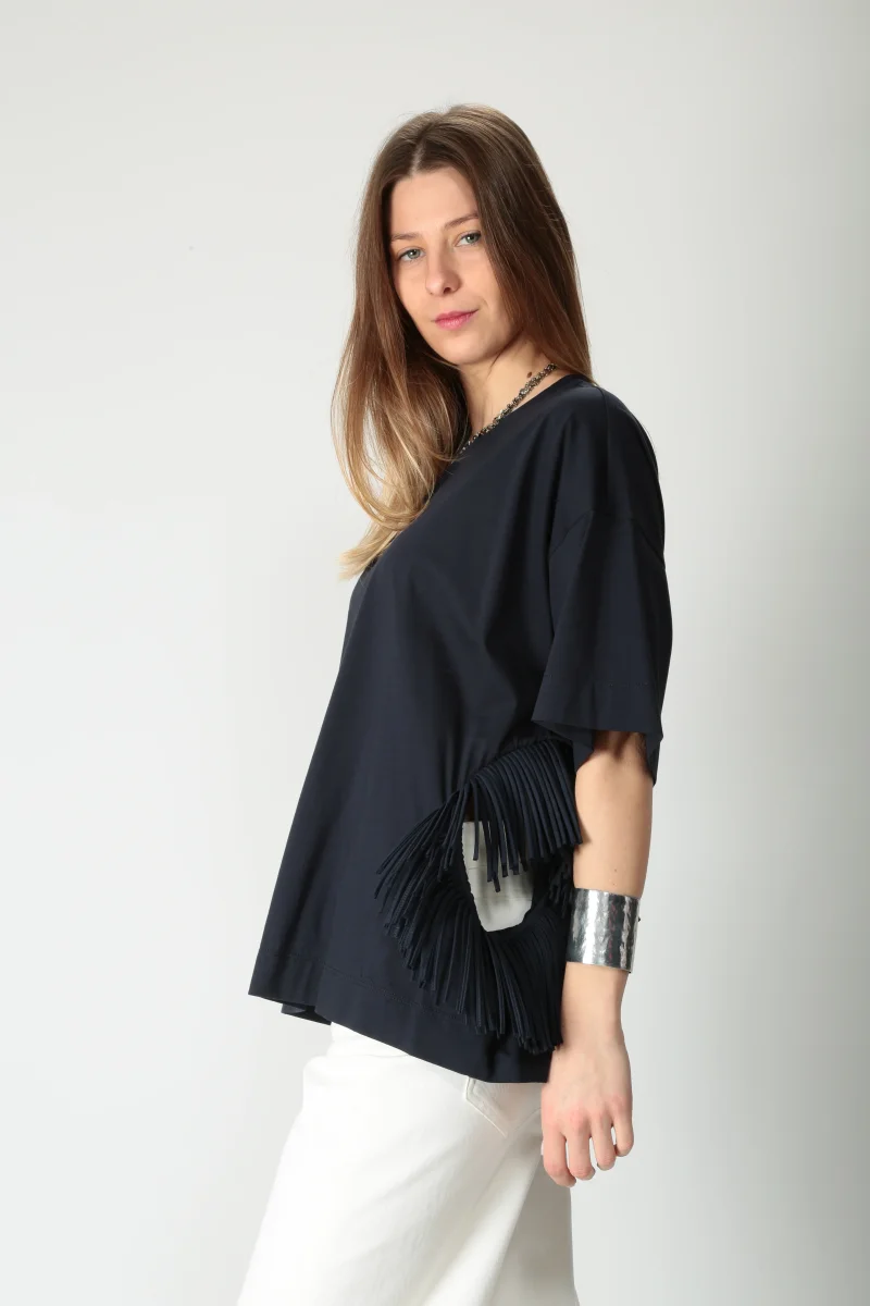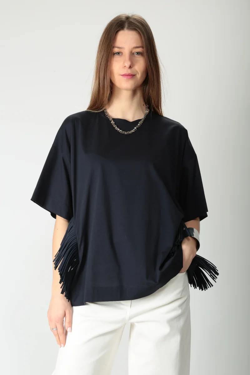 T-shirt in cotone. Girocollo. Spalla scesa a maniche corte. Apertura ad oblò sui lati con frangia applicata. Vestibilità ampia. Disponibile anche nel colore bianco.
