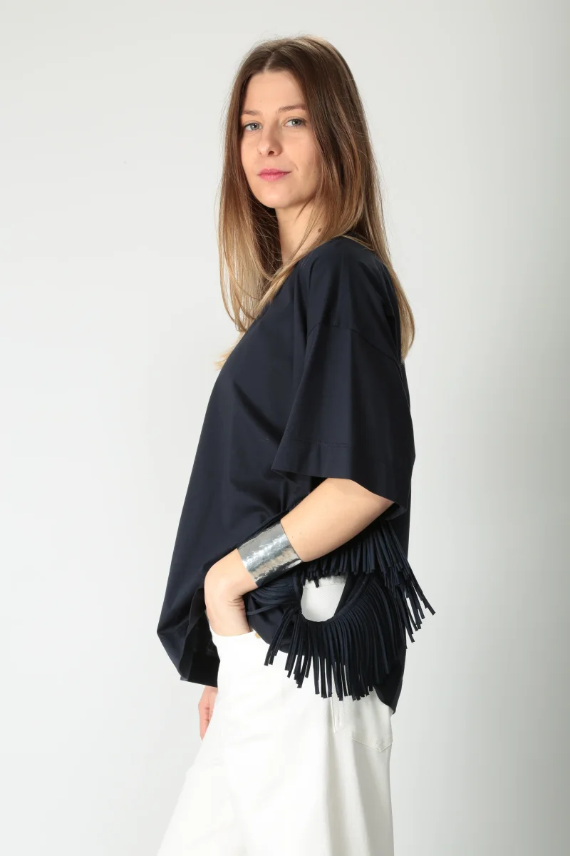 T-shirt in cotone. Girocollo. Spalla scesa a maniche corte. Apertura ad oblò sui lati con frangia applicata. Vestibilità ampia. Disponibile anche nel colore bianco. La modella indossa la taglia 40. La modella è alta 1,70 m. 100% Cotone – Codice articolo: M5PX06 – Colore articolo: blu – T-shirt in cotone – Girocollo – Maniche corte […]