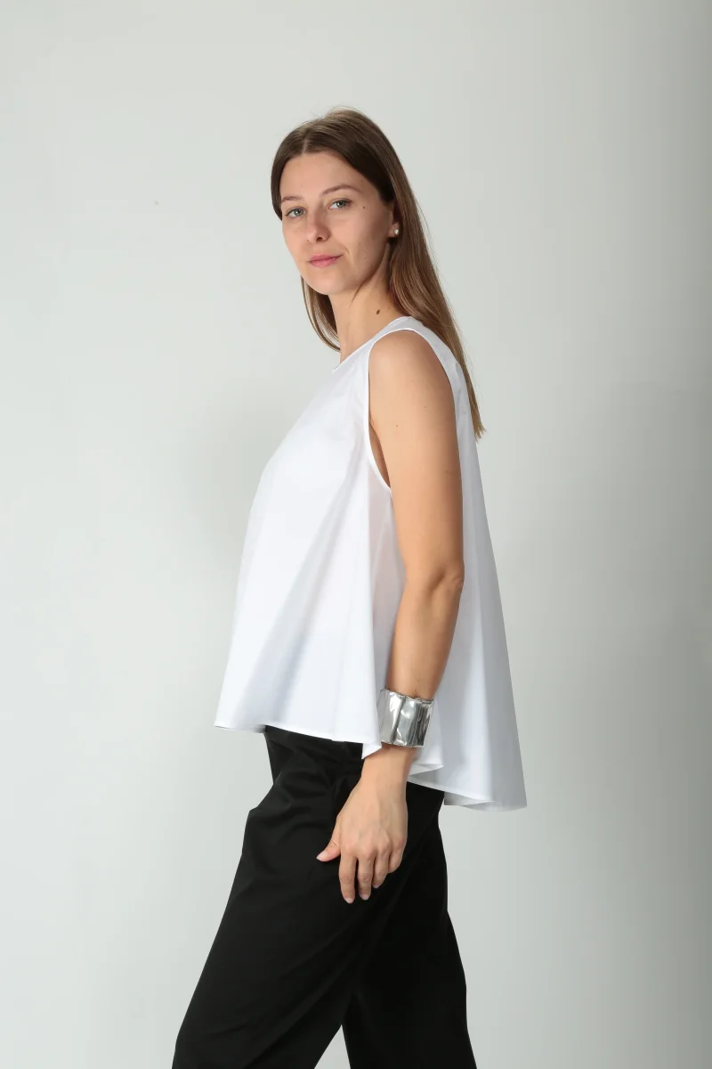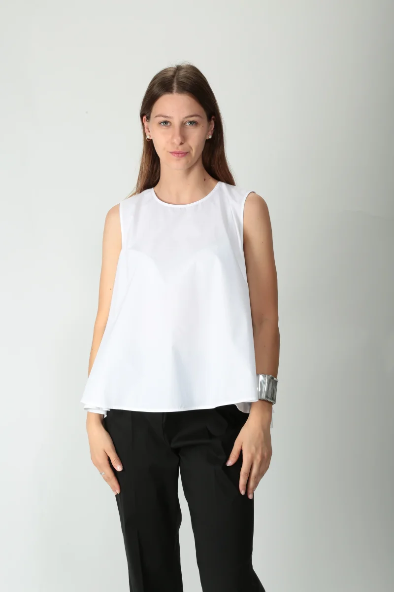 Top in popeline di cotone. Girocollo. Apertura nel centro dietro con bottone. Smanicato. Volume svasato e ampio. Più lunga nella parte posteriore. Disponibile anche nel colore marrone.