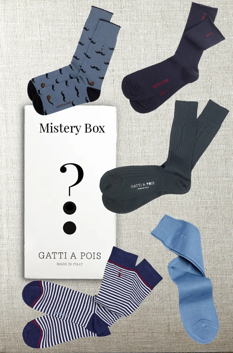 Rimarrete Stupiti dalla Bellezza delle Calze che riceverete a questo prezzo incredibile.. Scegli il Tuo Mistery Box e riceverai un Box da N.5 CALZE DA UOMO A MEZZA GAMBA Gatti a Pois dai Filati Naturali e Made in Italy. Mistery Box composto da 5 Calze a lunghezza Americana scelte tra gli Ultimi Modelli che potrete visionare sul sito, inserisci la taglia e noi sceglieremo per Te, i colori e i Modelli! E tu risparmi ancora di più! CONSEGNA IN 24/48 ORE! Vi arriveranno Calze dagli Ottimi Filati tra Filo di Scozia e Cotone Pettinato! Gatti a Pois ha studiato accostamenti…