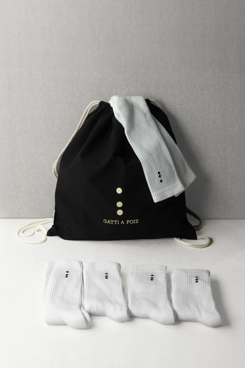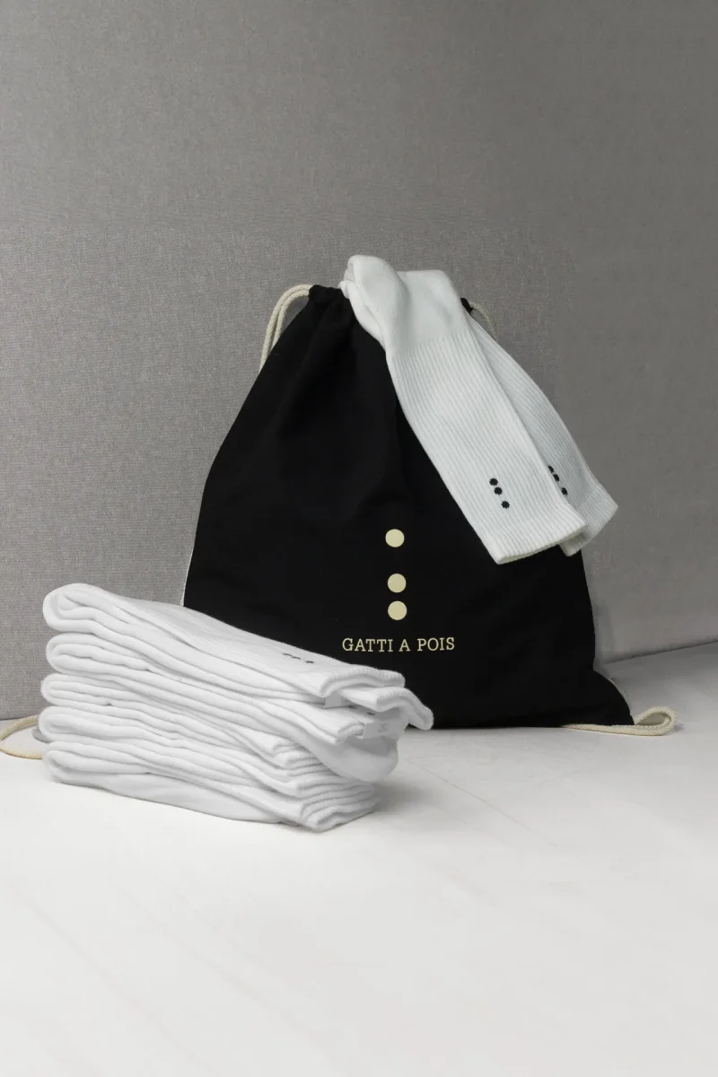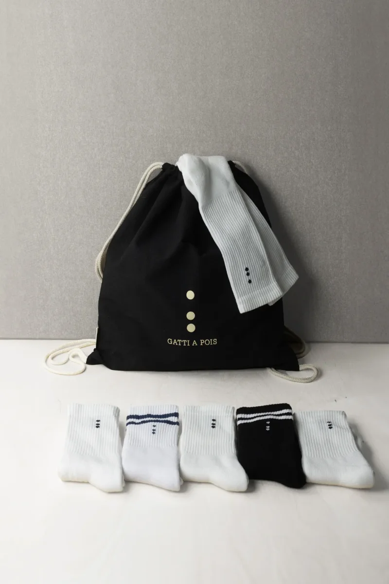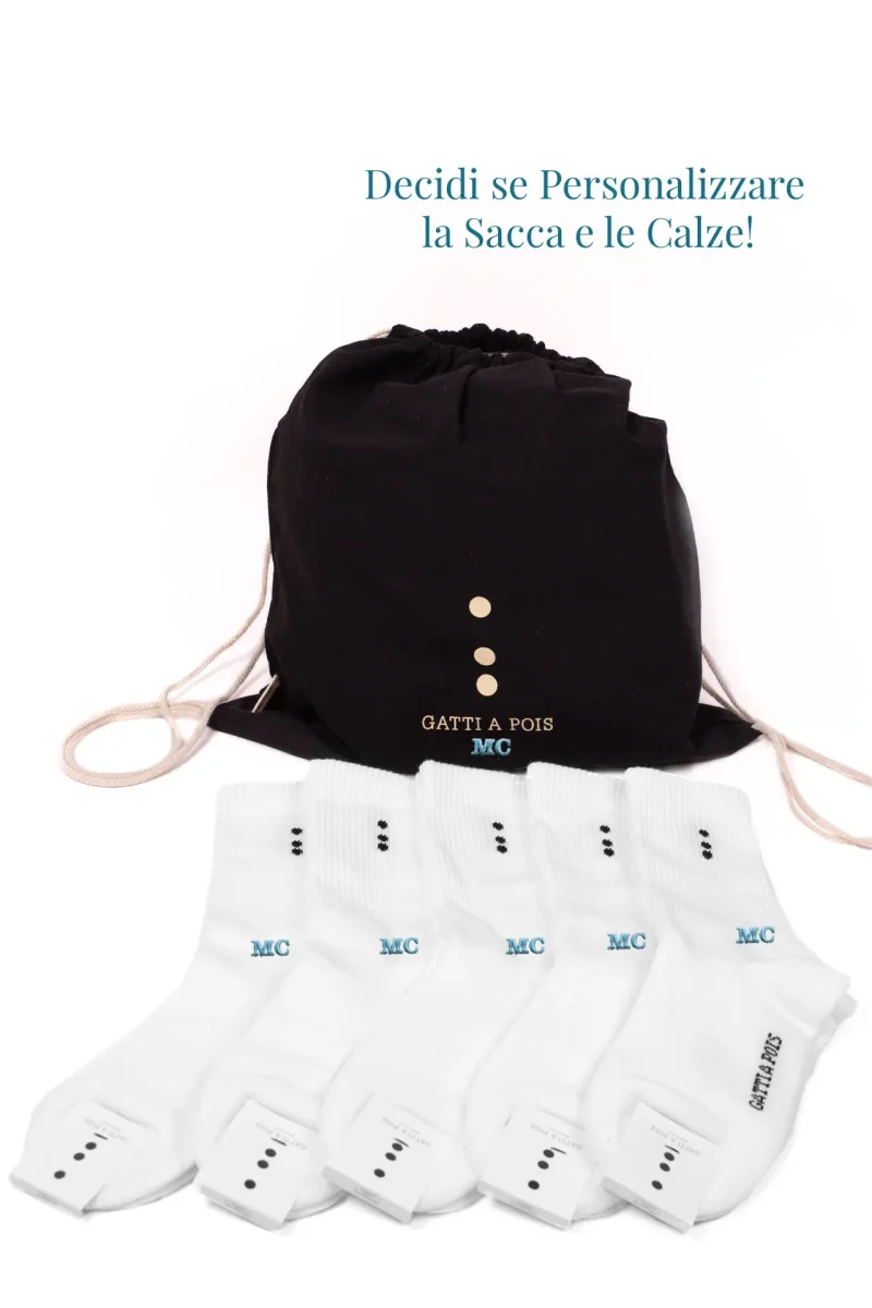 Sportivo e amante del Bello, dell’Alta Qualità del Comfort? Per te la nostra Sacca in Cotone Ecologico in Regalo se acquisti N.5 Paia Calze Sportive Unisex in quattro taglie differenti, che potrai Personalizzare in vari modi con le Tue Iniziali. Qualità e durata nel tempo Made in Italy, Realizzate con COTONE PETTINATO ITALIANO lavorazione a SPUGNA. Gatti a Pois propone le nuove Calze Sportive 100% Made in Italy da Uomo o Donna dalla Linea Classica ed Essenziale. Hanno una misura di cm 26 dal tallone, perfette per Sneakers o scarpe Medio Alte. Adatte a Sport quali Tennis o Padel, ma…