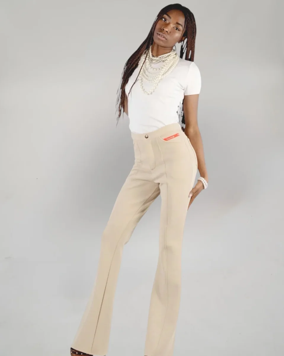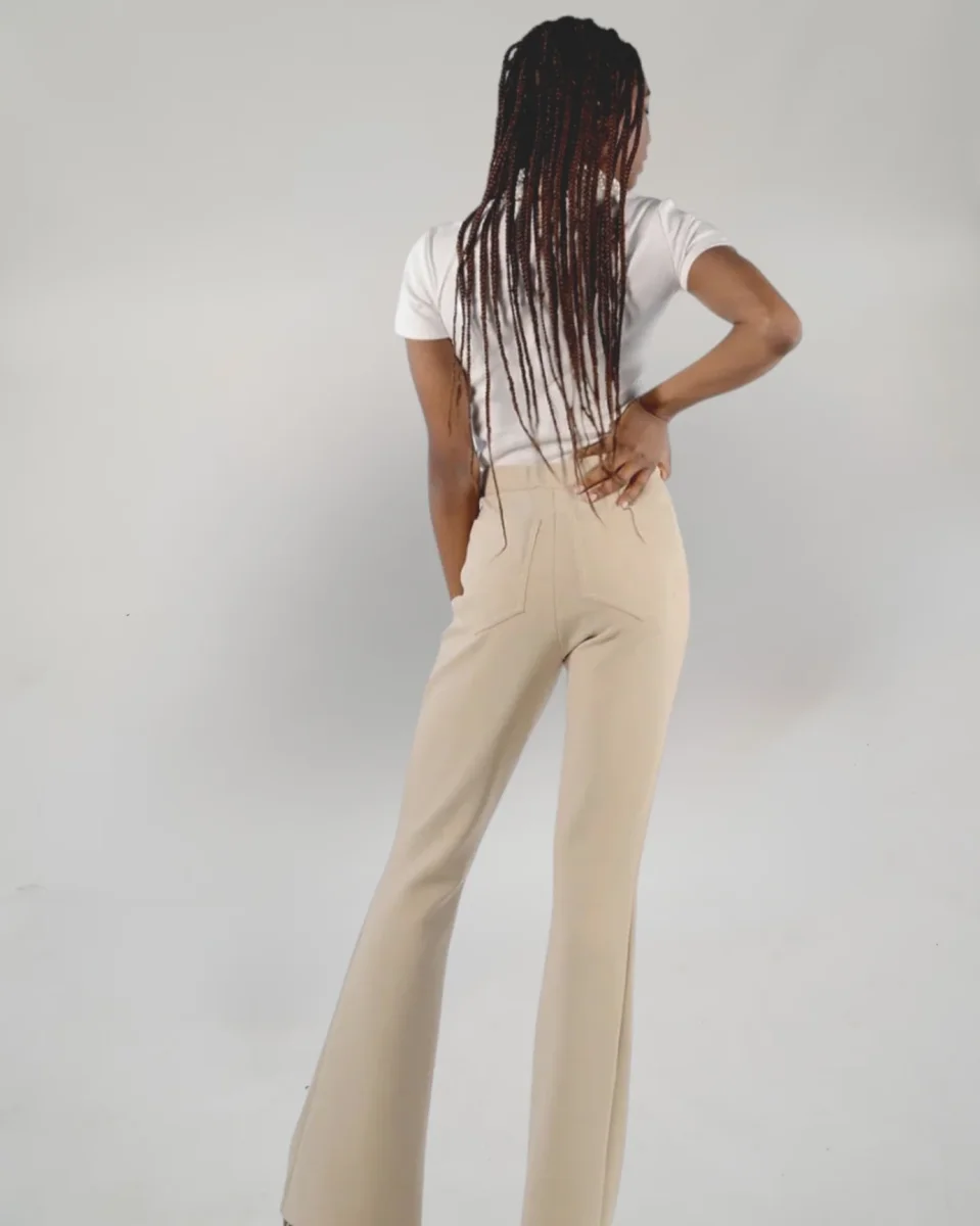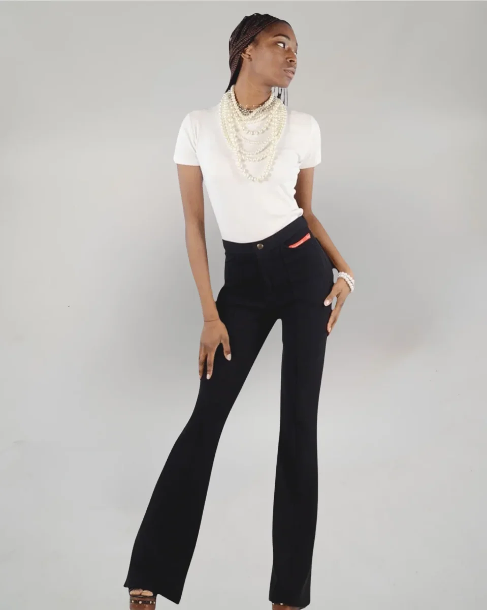 La vita alta sottolinea il punto vita con eleganza, mentre la gamba svasata dona slancio e versatilità: perfetta con tacchi alti per look sofisticati o con sneakers per uno stile più casual. La vestibilità slim e il fascione in vita completano un capo pensato per adattarsi con disinvoltura a diverse occasioni.