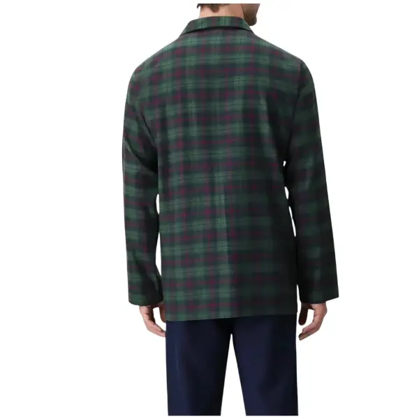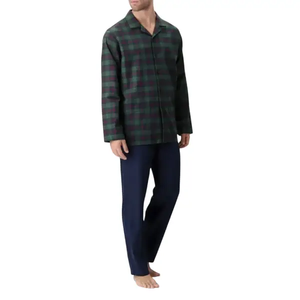 La casacca presenta un collo classico e un’apertura frontale con bottoni. Questo dettaglio conferisce al pigiama un aspetto elegante e sempre attuale. La fantasia scozzese, ricercata e distintiva, valorizza il capo con un tocco di personalità. Per questo motivo il modello risulta ideale per l’uomo che desidera uno stile curato anche nei momenti di relax.