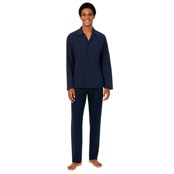 Il pigiama uomo cotone invernale Ragno offre eleganza e comfort. Realizzato in interlock di cotone caldo, è composto da giacca aperta con collo e pantaloni morbidi tinta unita.