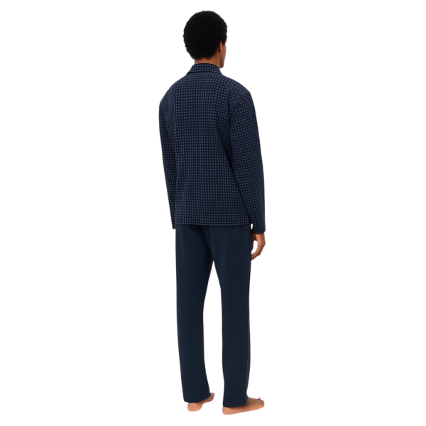 La giacca aperta con collo classico esprime uno stile sobrio e raffinato. La stampa cravatteria blu dona un tocco sofisticato, perfetto per chi apprezza un’eleganza discreta anche nei momenti di relax. Inoltre, il taschino applicato sul petto aggiunge un dettaglio funzionale e ricercato.