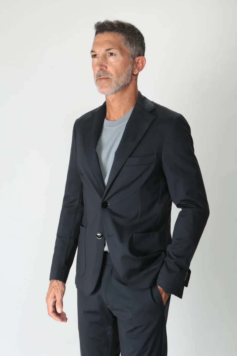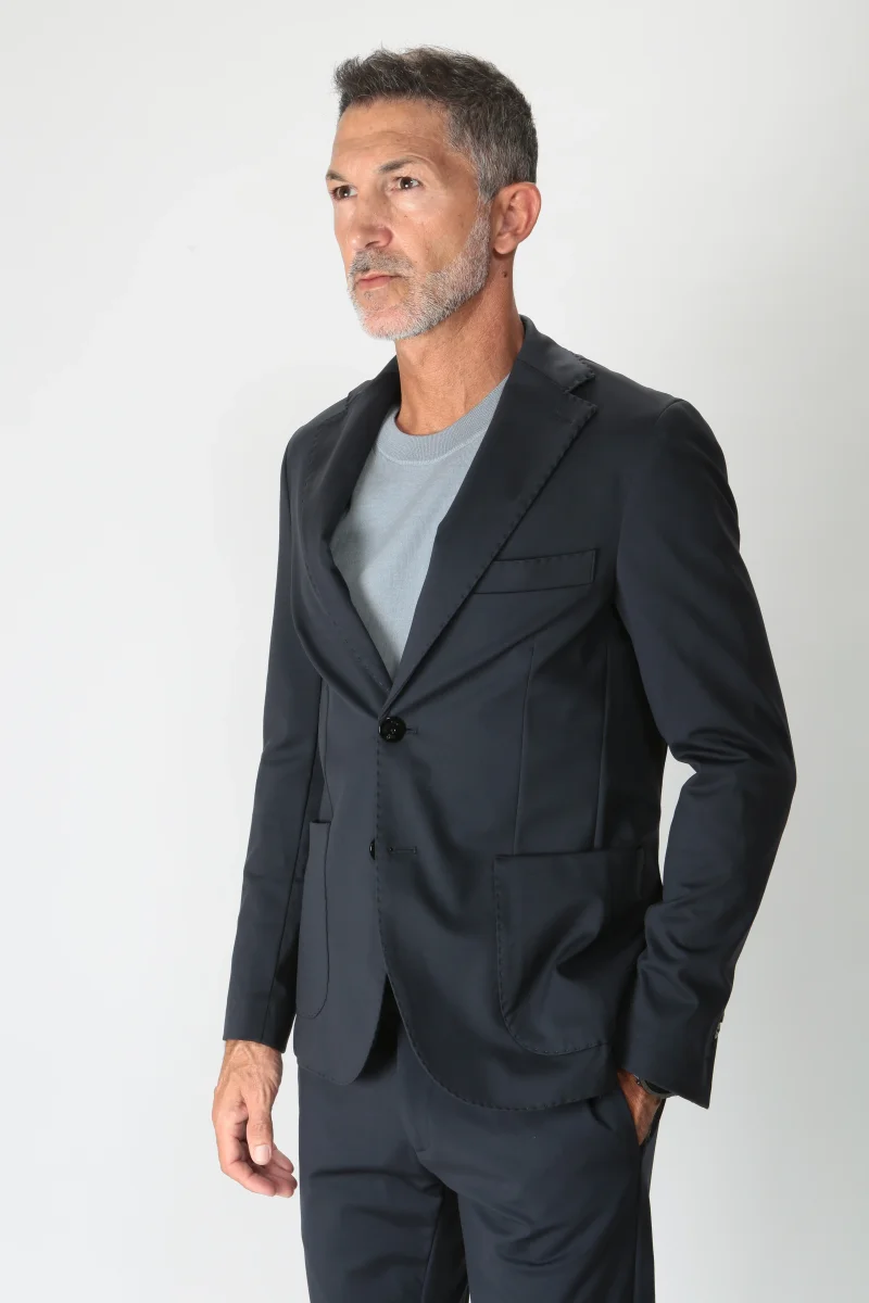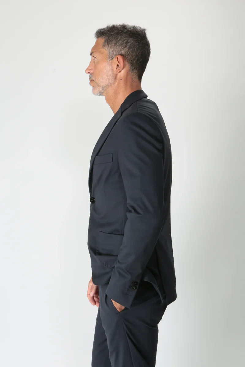 Giacca monopetto in tessuto tecnico. Rever a lancia. Manica lunga con polso chiuso da quattro bottoni. Taschini interni. Chiusura con bottoni. Doppio spacco nella parte posteriore. Possibilità di abbinarla al suo pantalone – art. Tobi-