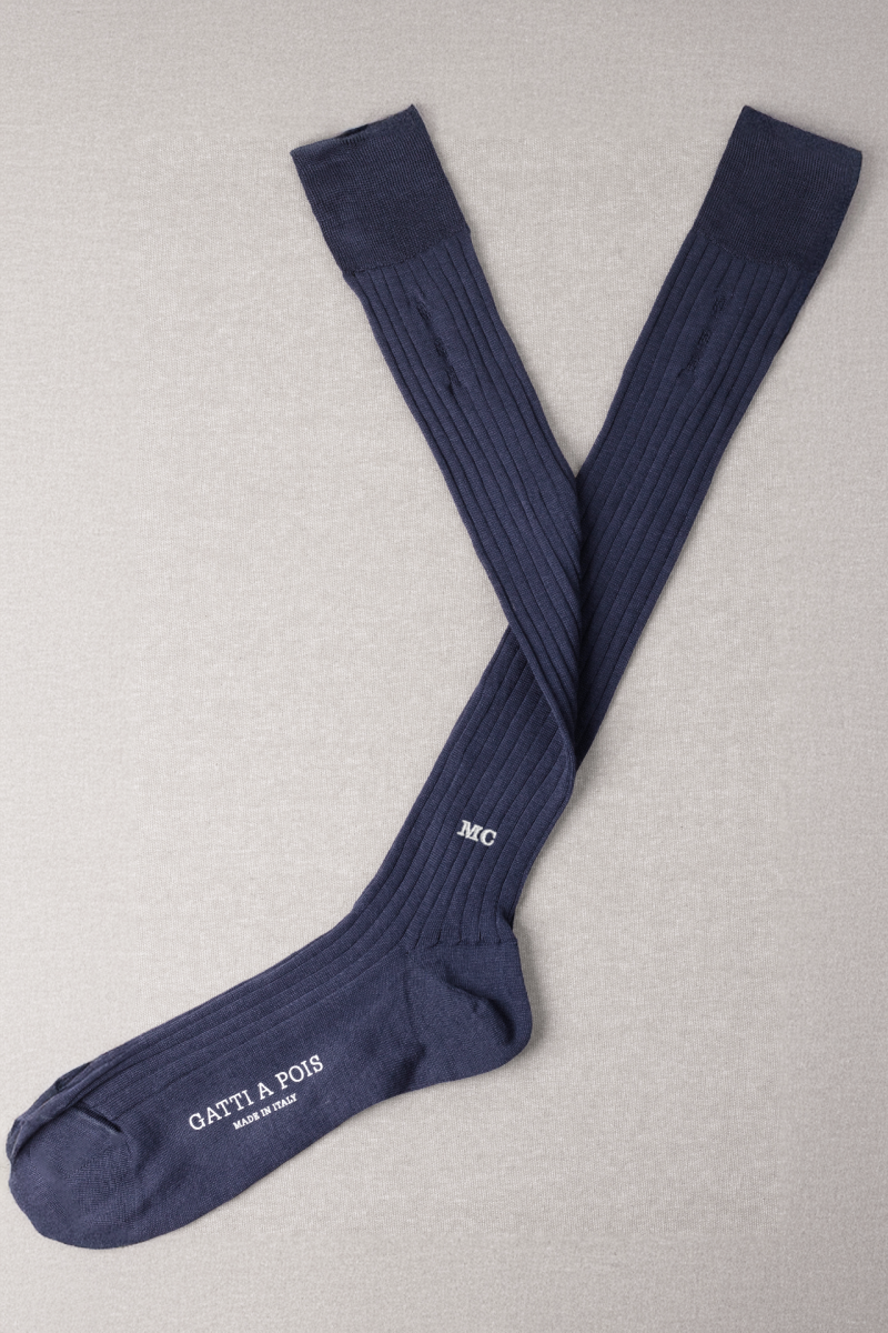 Calze in Puro Filo di Scozia a Costine di Alta qualitร Made in Italy rimagliate a mano. Vestibilitร perfetta e ideale per i Gentlemen contemporanei. Personalizzabili con Iniziali.