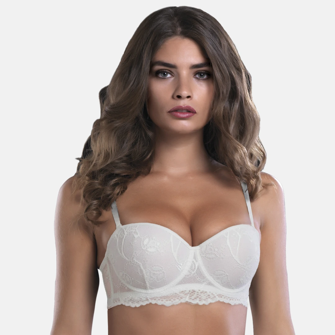 Reggiseno a fascia in pizzo con ferretto, coppe graduate e spalline staccabili.