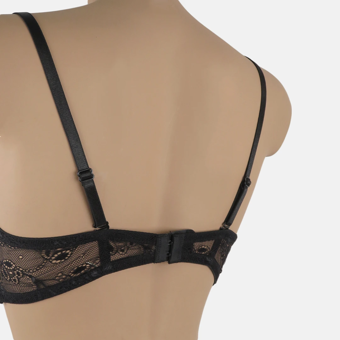 Il pizzo raffinato avvolge delicatamente la fascia, mentre le coppe imbottite e graduate modellano il seno offrendo un effetto pieno e armonioso.