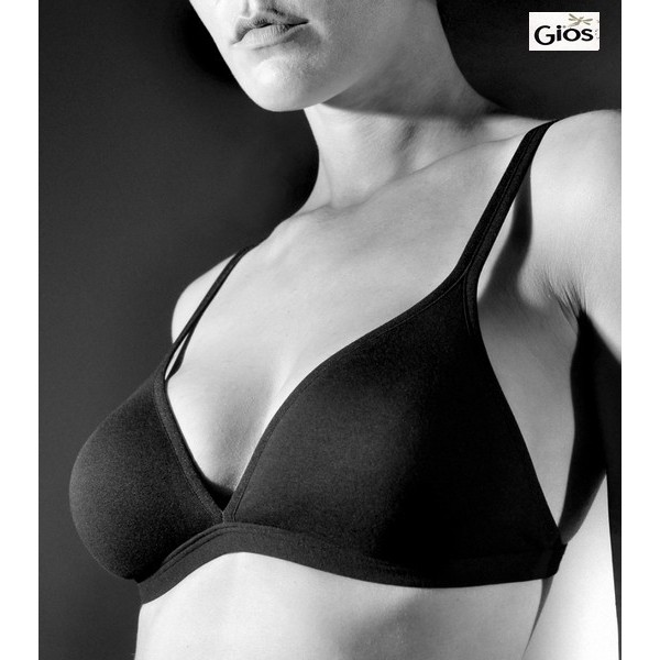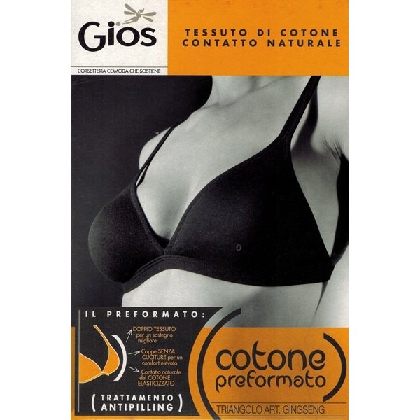 REGGISENO A TRIANGOLO GIOS ART. GINSENG IN COPPA B REGGISENO DONNA REALIZZATO IN MORBIDO COTONE ELASTICIZZATO CON COPPE IN DOPPIO TESSUTO E PREFORMATE SENZA CUCITURE LO STILE MINIMAL DELLA COSTRUZIONE DI COPPA E FIANCO RENDONO IL REGGISENO IDEALE PER ESSERE INDOSSATO SOTTO GLI ABITI PIU’ SCOLLATI SIA DAVANTI CHE DIETRO TAGLIE DISPONIBILI: 1-2-3 COLORI DISPONIBILI: BIANCO-NERO COMPOSIZIONE DEL PRODOTTO: 90% COTONE 10% ELASTAN QUALITA’ GIOS