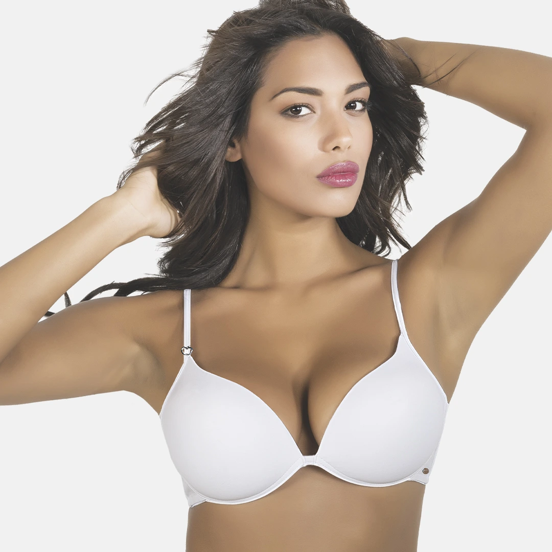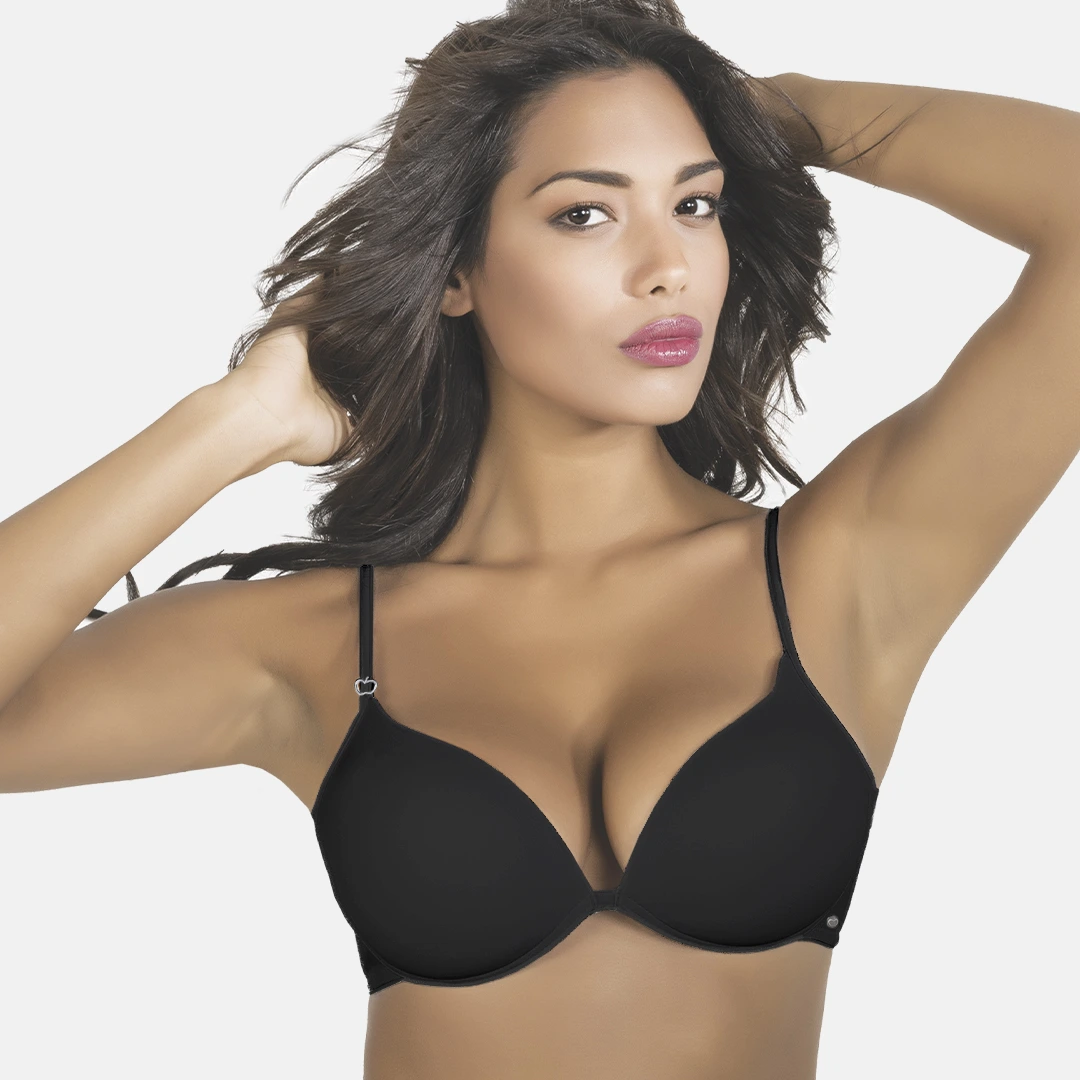 Reggiseno push-up in microfibra a doppia imbottitura, senza ferretto, ideale per un décolleté naturalmente valorizzato. Disponibile in bianco e nero.
