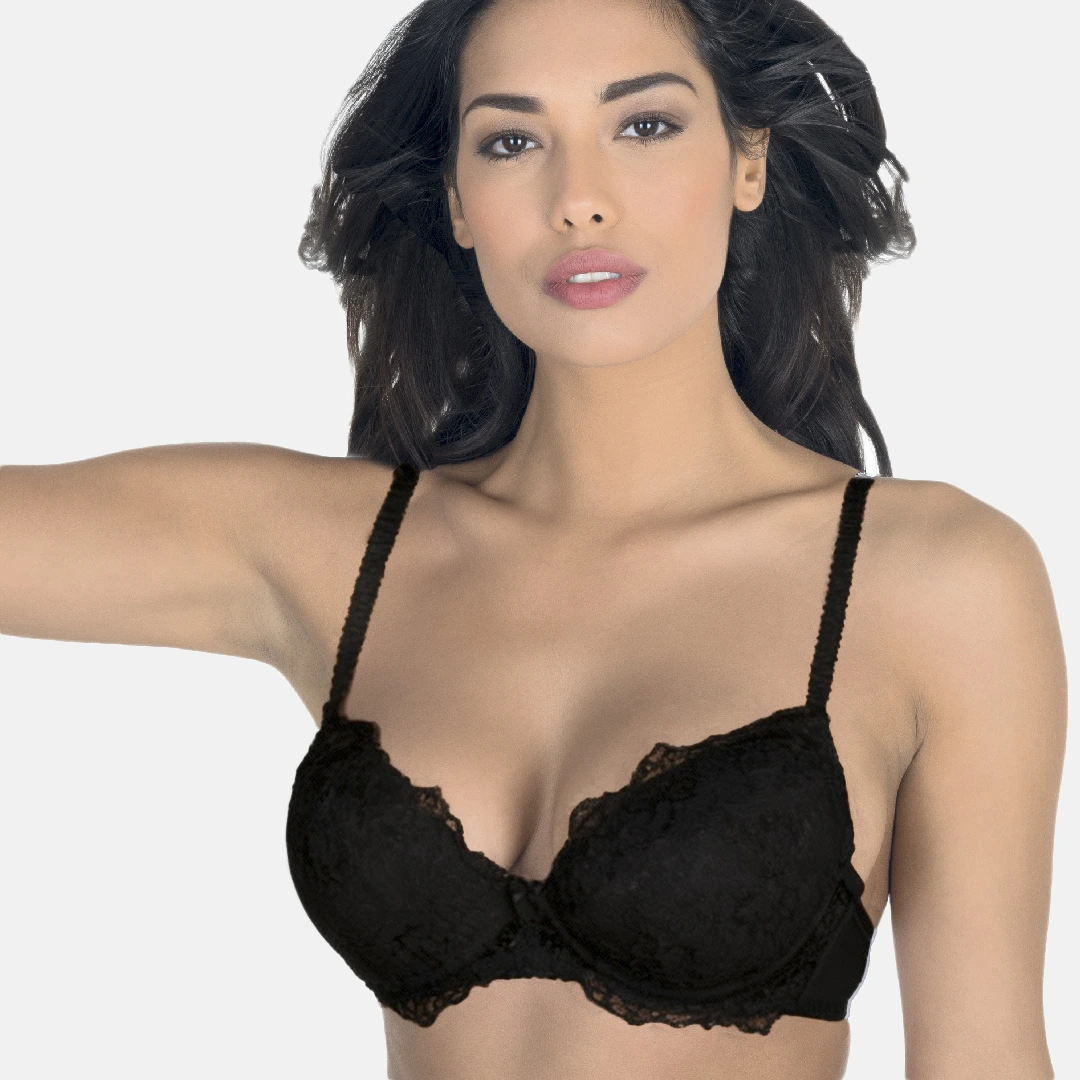 Reggiseno in pizzo imbottito e preformato, dotato di ferretto comfort per un sostegno naturale. Disponibile in bianco e nero, fino alla taglia 6.