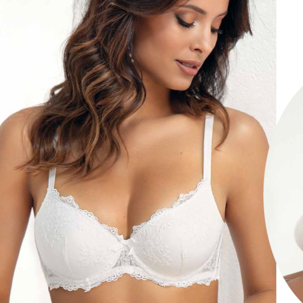Reggiseno imbottito con ferretto e spalline regolabili in pizzo e tulle. Composizione: PL50 PA45 EA5