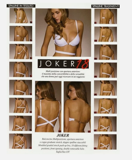- IL REGGISENO PUSH UP JOKER 18 FA PARTE DELLA SERIE BASIC DI LORMAR, È UN PUSH UP CON COPPE CON IMBOTTITURA GRADUATA. MORBIDO E COMODO DA INDOSSARE, IL TESSUTO LISCIO E DELICATO CONSENTE DI INDOSSARE IL REGGISENO JOKER 18 ANCHE SOTTO ABITI ADERENTI. LA SCOLLATURA PROFONDA DEL REGGISENO OLTRE AD ESSERE SENSUALE E BELLO, RISALTA LE CURVE E DIVENTA INVISIBILE SOTTO MAGLIE O ABITI CON SCOLLATURA A V.IL REGGISENO PUSH UP JOKER 18 È UN BALCONCINO MULTIPOSIZIONE CON APERTURA ANTERIORE CON GANCI A FORMA DI CUORE. IL REGGISENO JOKER 18 HA IL FERRETTO.