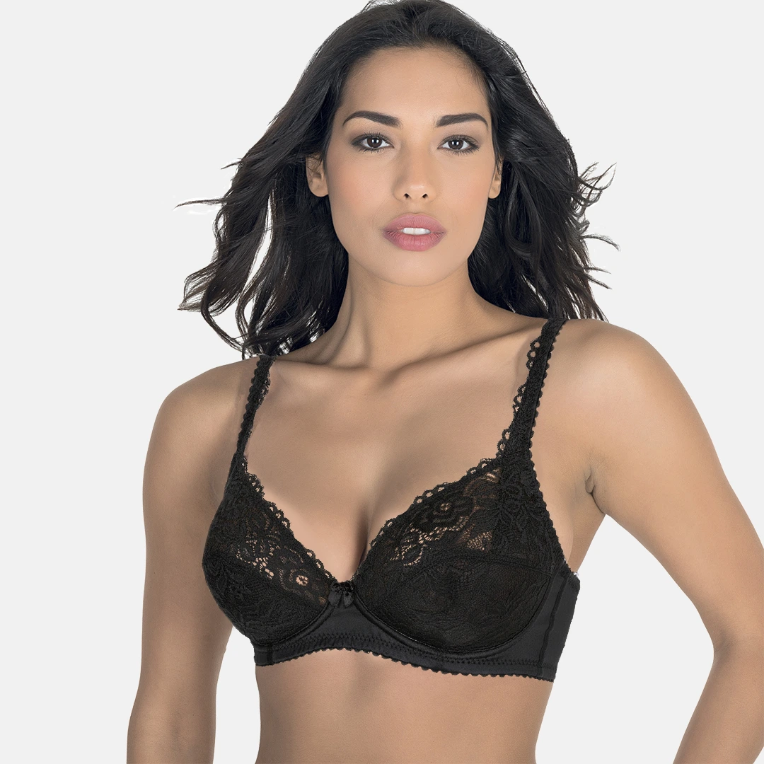 Reggiseno in microfibra e pizzo elasticizzato con coppe rinforzate e cuciture che garantiscono sostegno e comodità. Fino alla taglia 8.