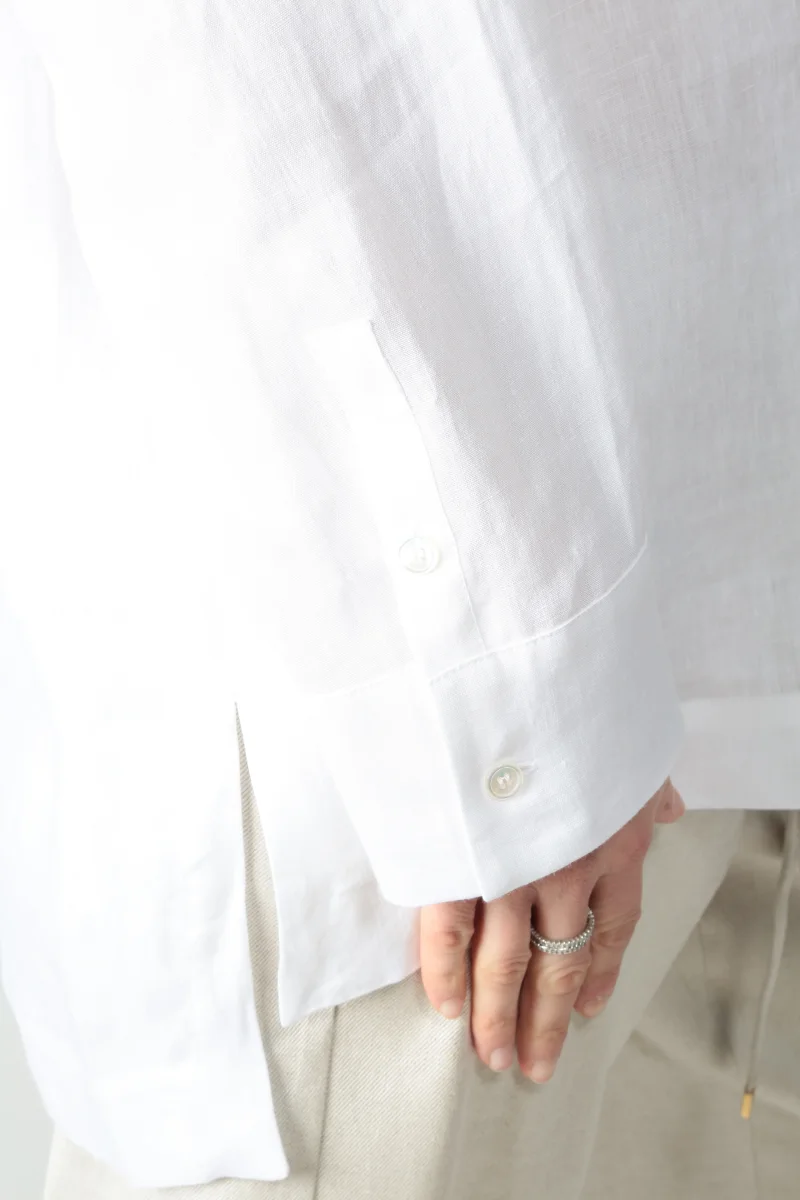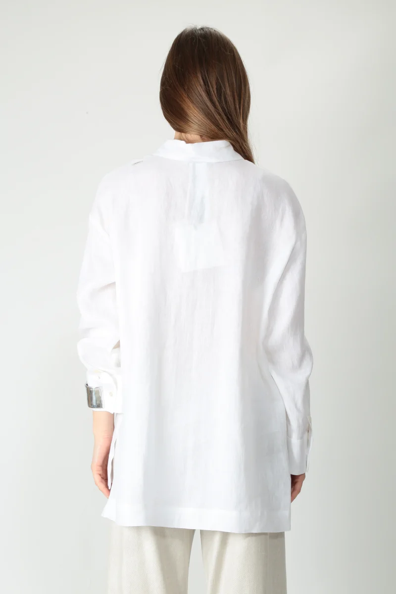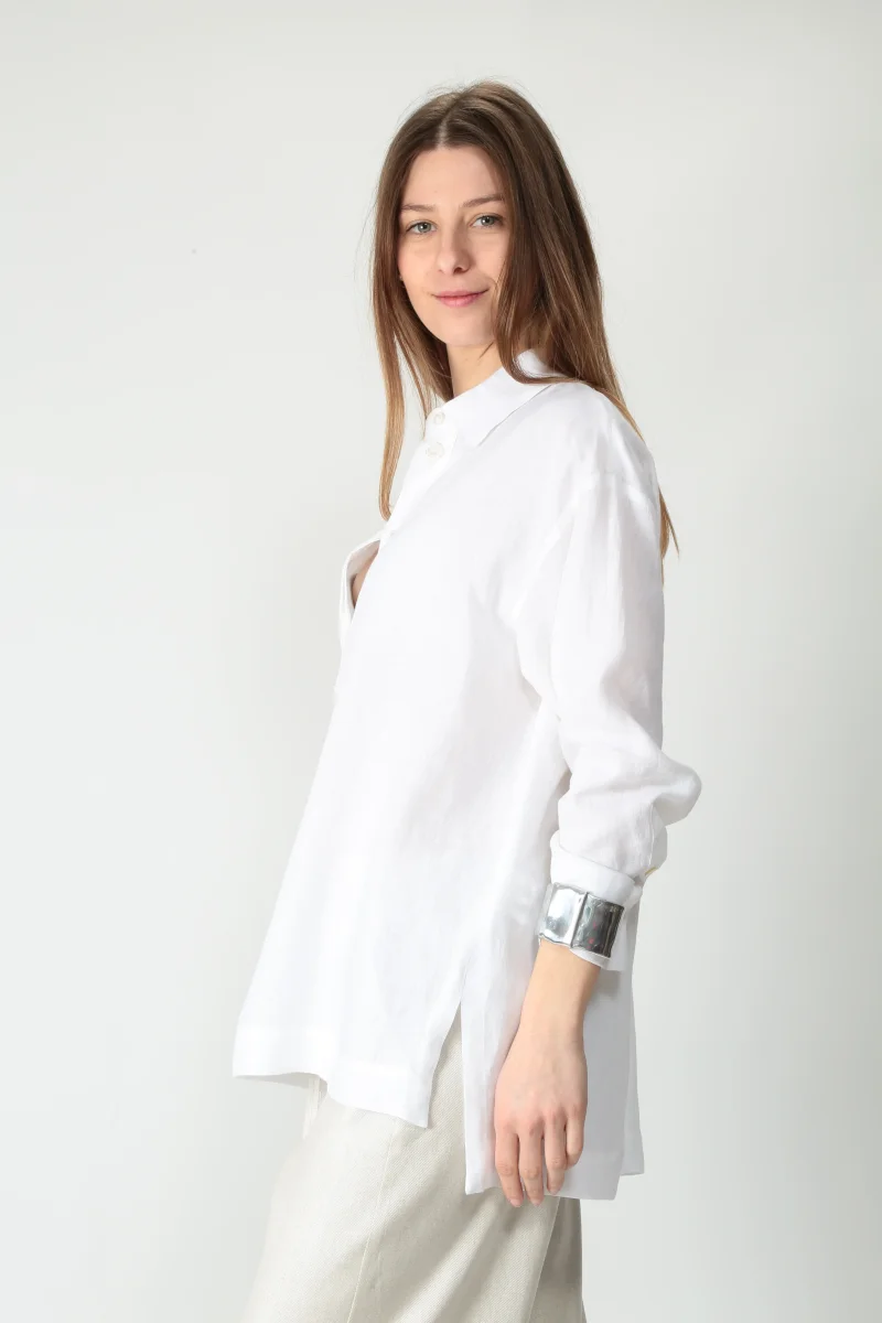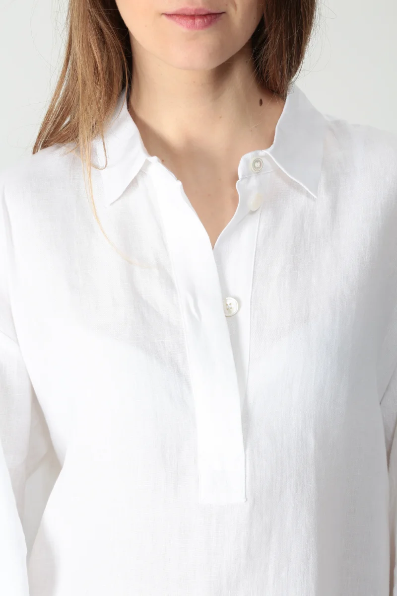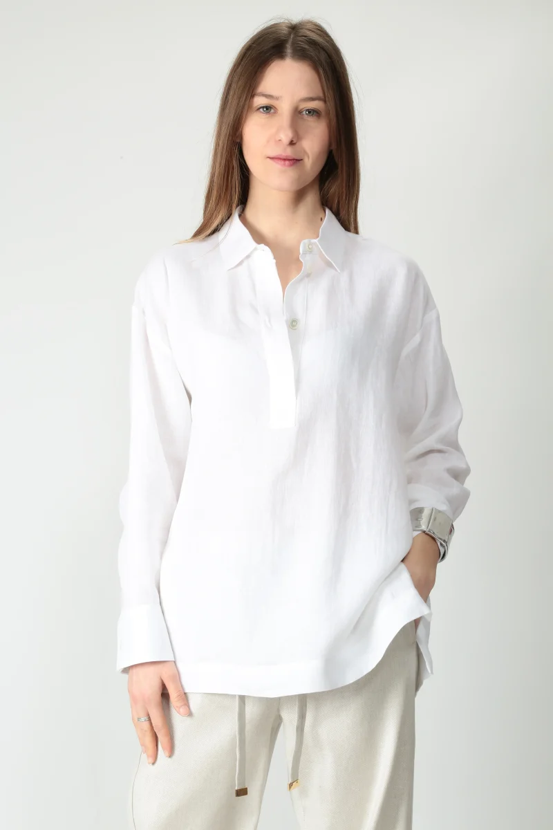 Camicia modello polo in tela di puro lino. Collo a camicia. Scollo profondo con chiusura con bottoni. nascosti. Manica lunga e larga con polso chiuso da due bottoni. Più lunga nella parte posteriore. Spacchi laterali. Volume ampio.