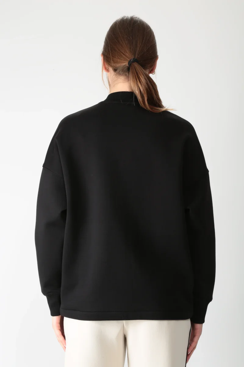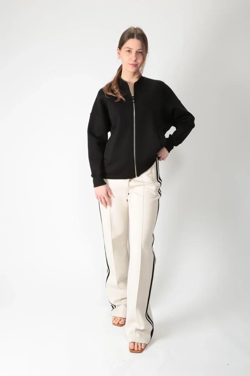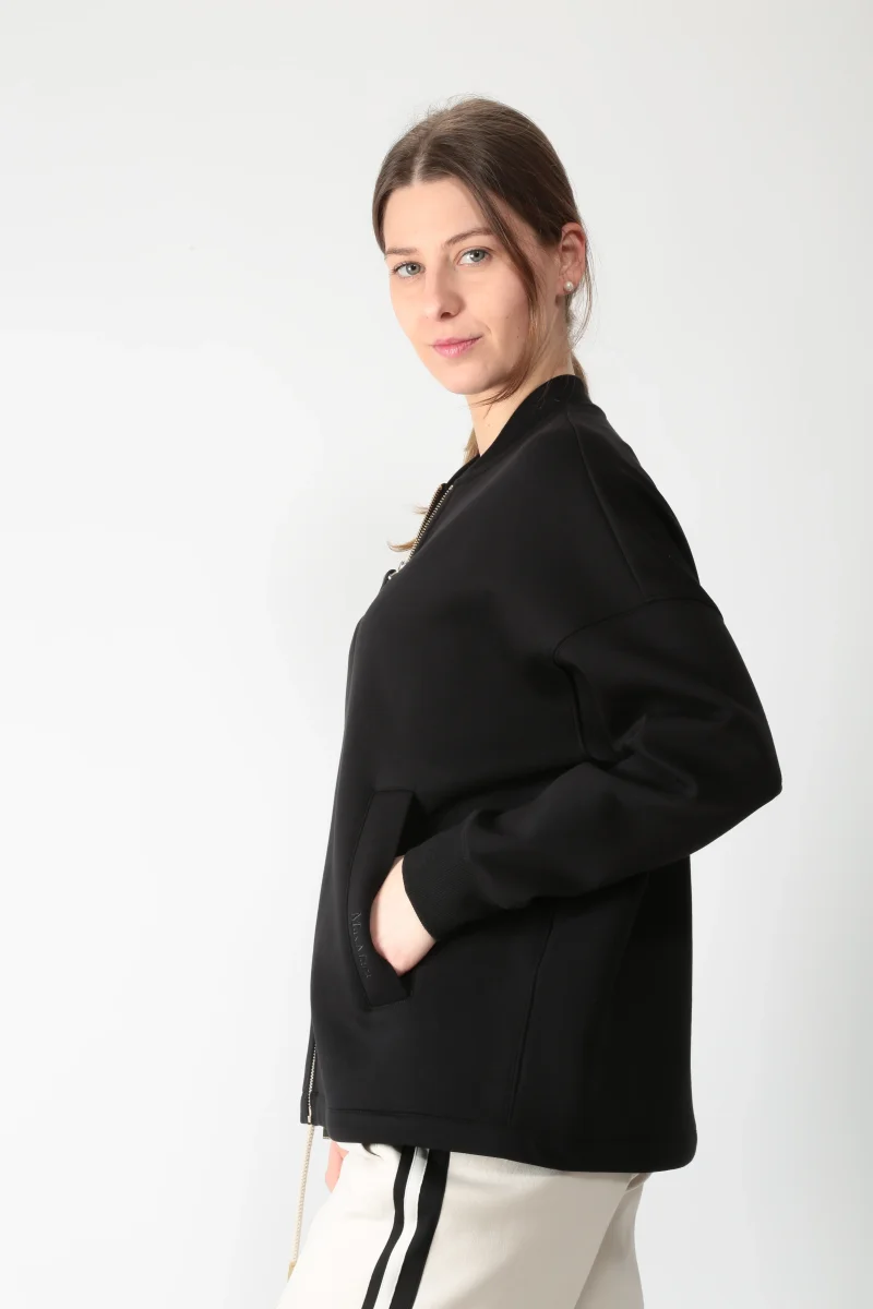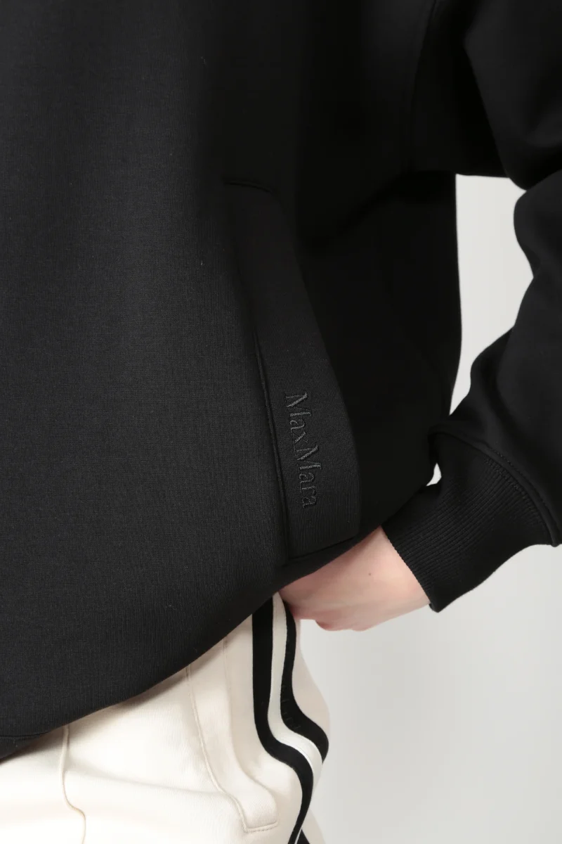 Felpa in scuba modello bomber. Colletto e polsini in maglia a costine. Spalla scesa. Manica lunga. Chiusura con zip e tirazip con dettaglio logo. Tasche a filetto con ricamo Max Mara sulla tasca sinistra. Vestibilità morbida.