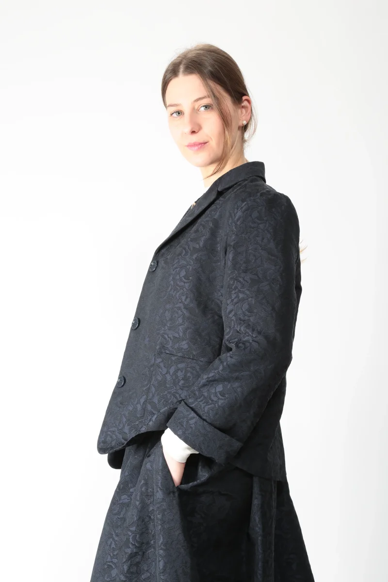 Giacca monopetto realizzata con lavorazione jacquard in misto cotone. Disegno floreale. Collo a rever. Maniche con risvolto e spacchetto sul polso. Chiusura con bottoni nascosti.