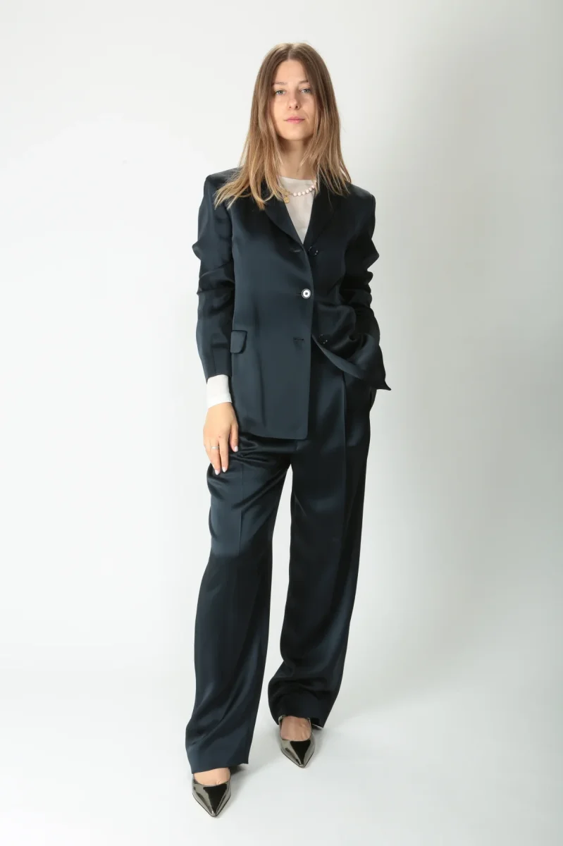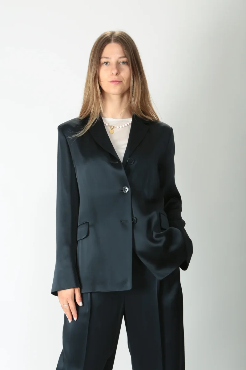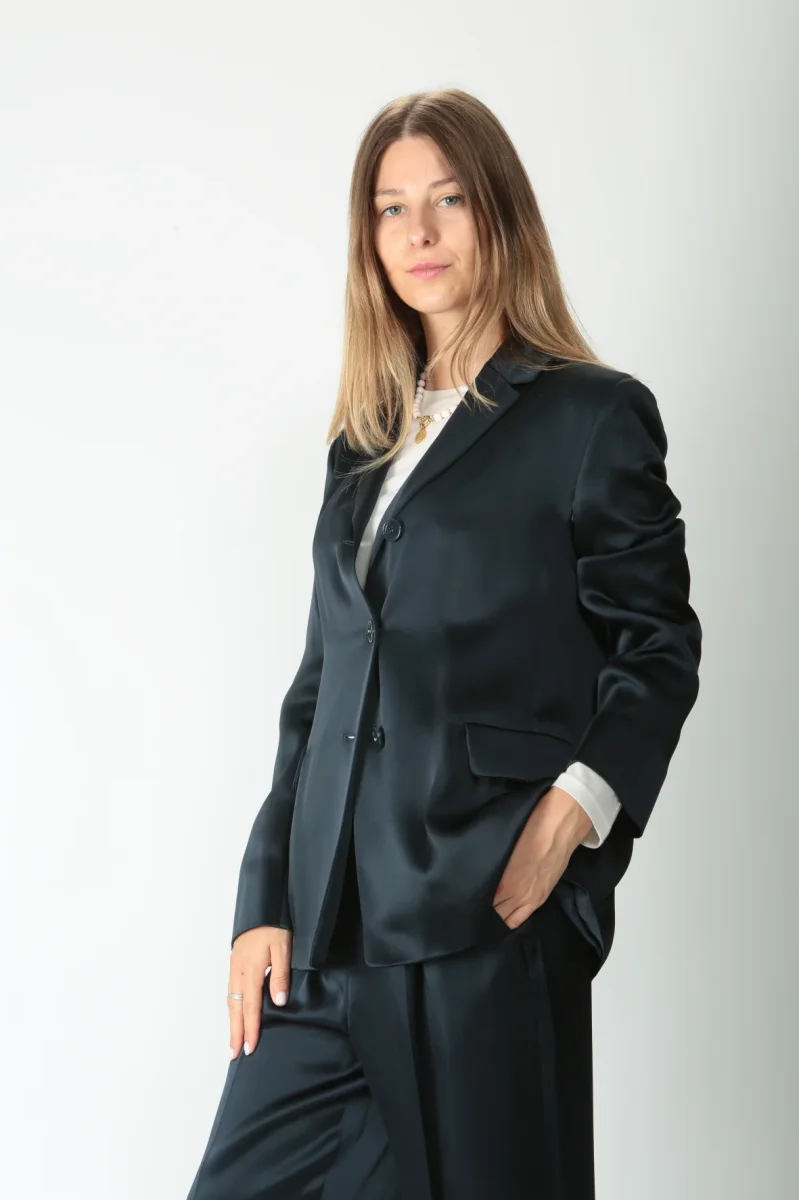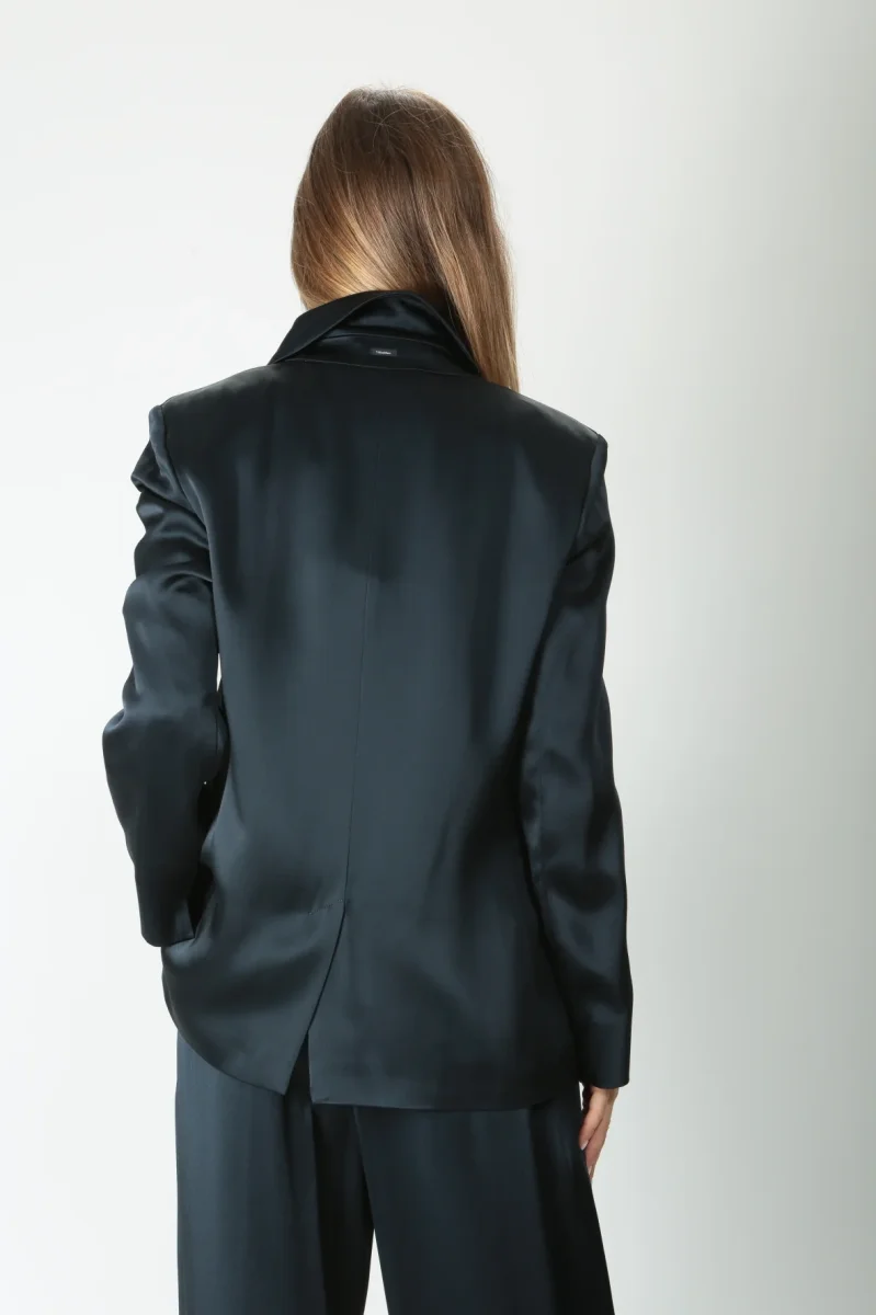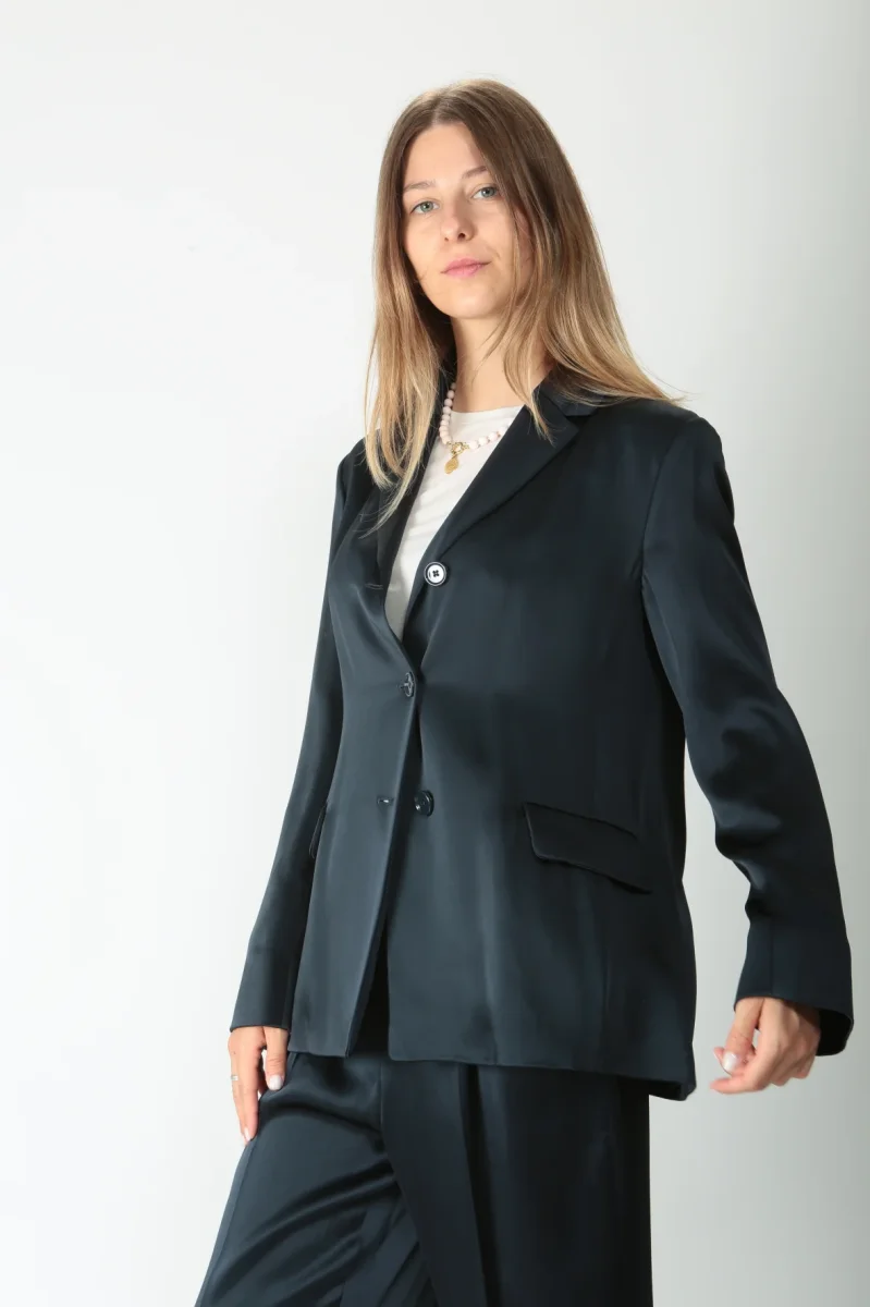 Giacca monopetto in raso leggero di misto viscosa. Rever a lancia. Chiusura con tre bottoni tono su tono. Tasche a filetto con patta. Manica lunga priva di polso con piccolo spacco. Spacco centrale nella parte posteriore. Volume fluido. Foderata.