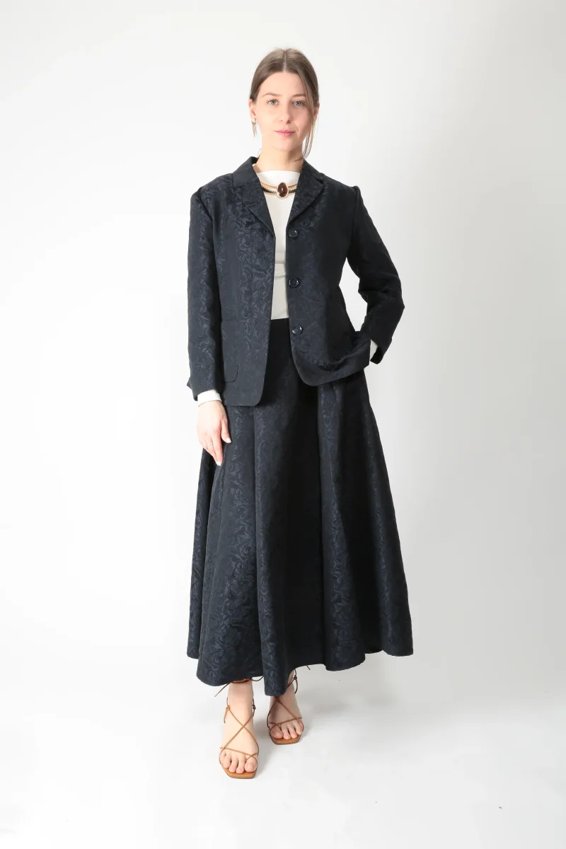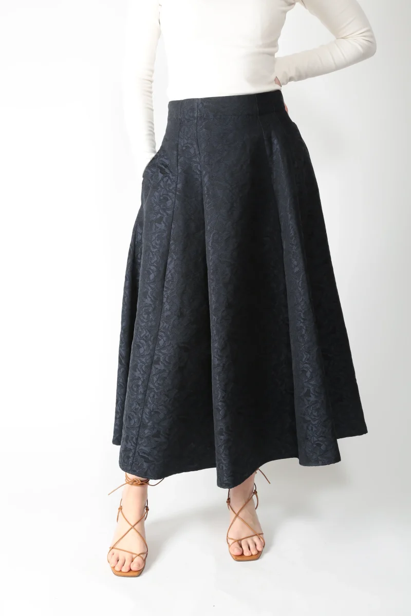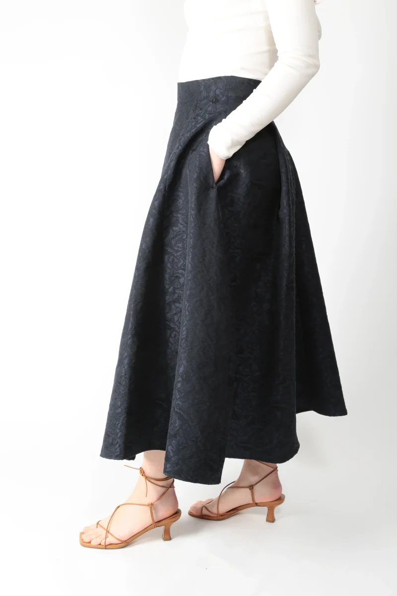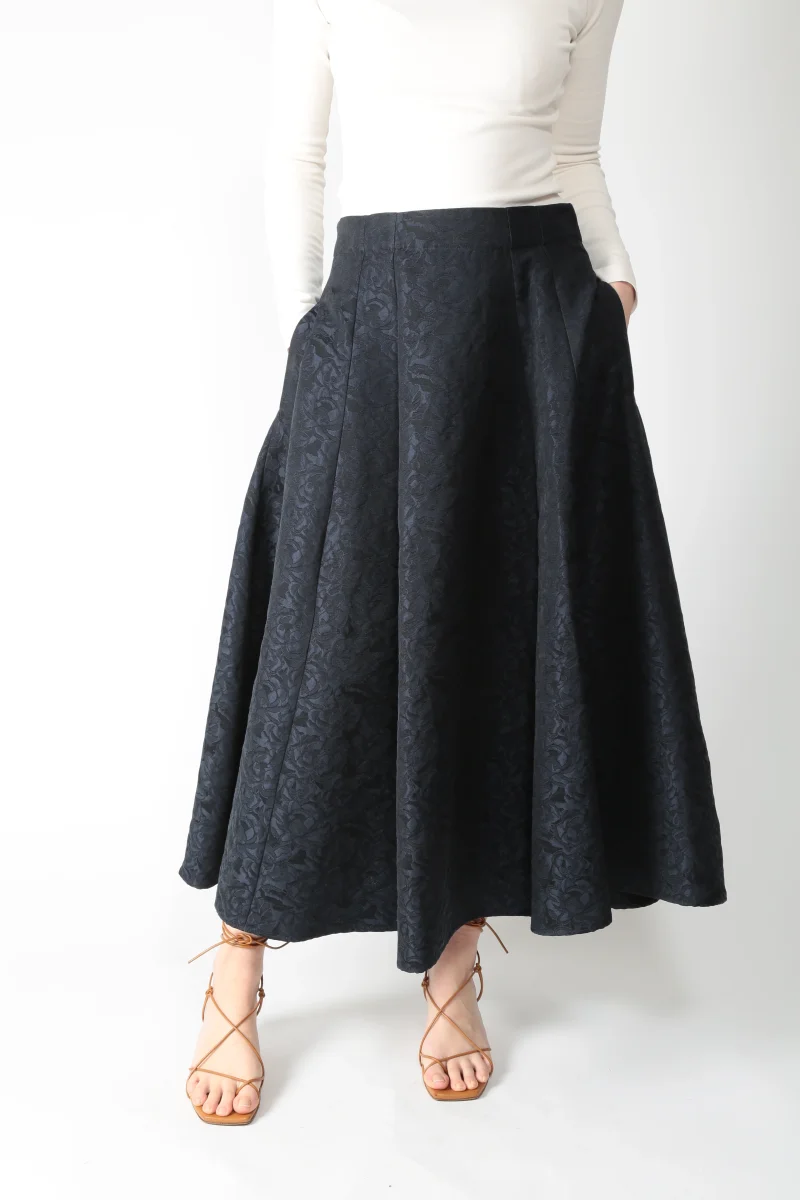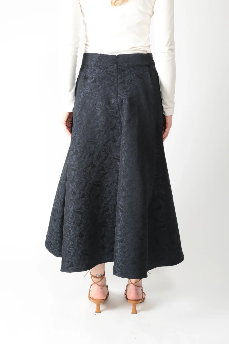 Gonna lunga realizzata in jacquard di misto cotone. Disegno floreale. Chiusura con zip nascosta nel centro dietro. Tasche a filetto sui fianchi. Modello a pieghe, con linea svasata. Sfoderata. Possibilità di abbinarla alla sua giacca – art. SMMGioire –