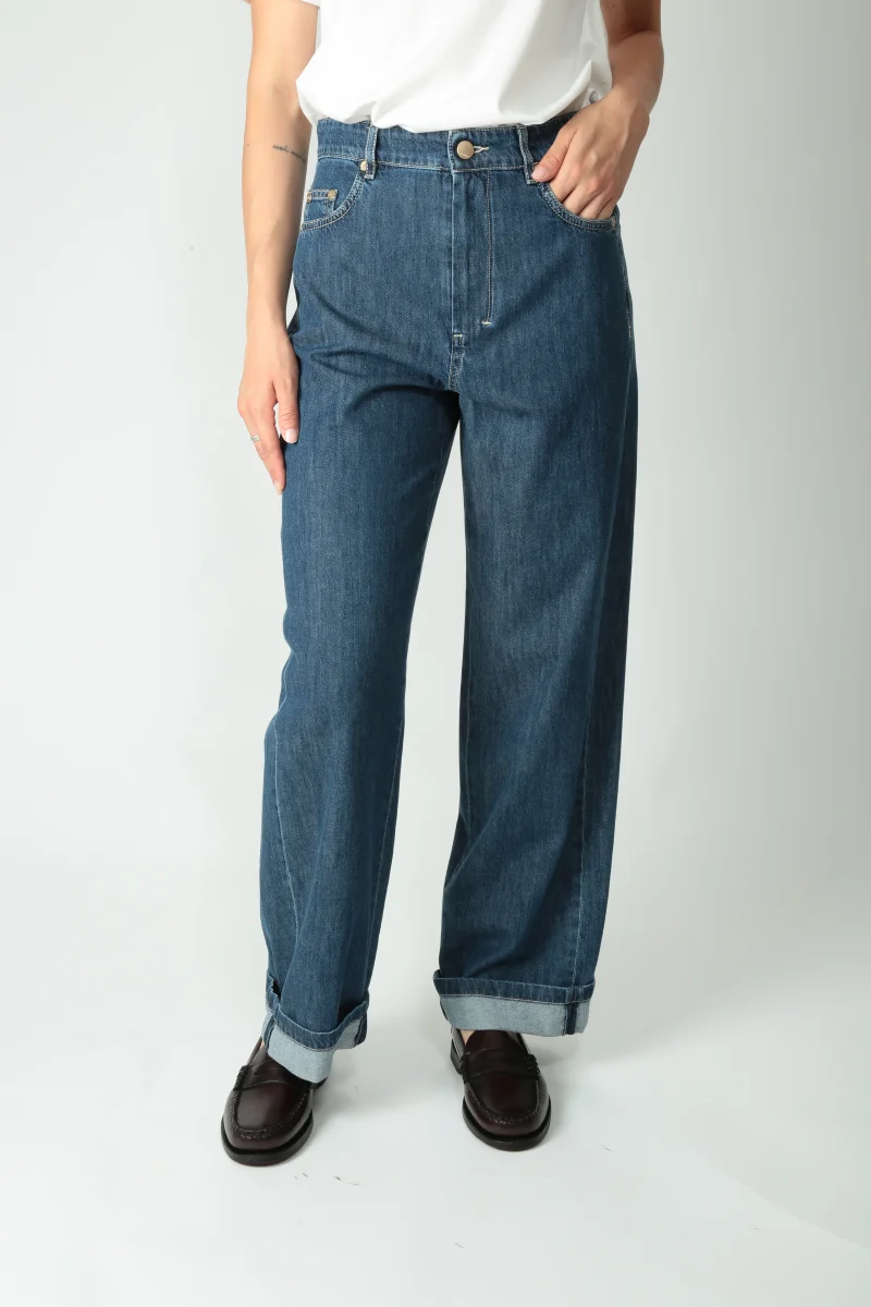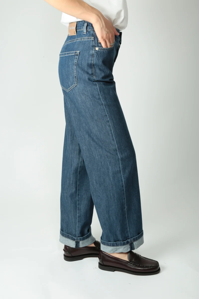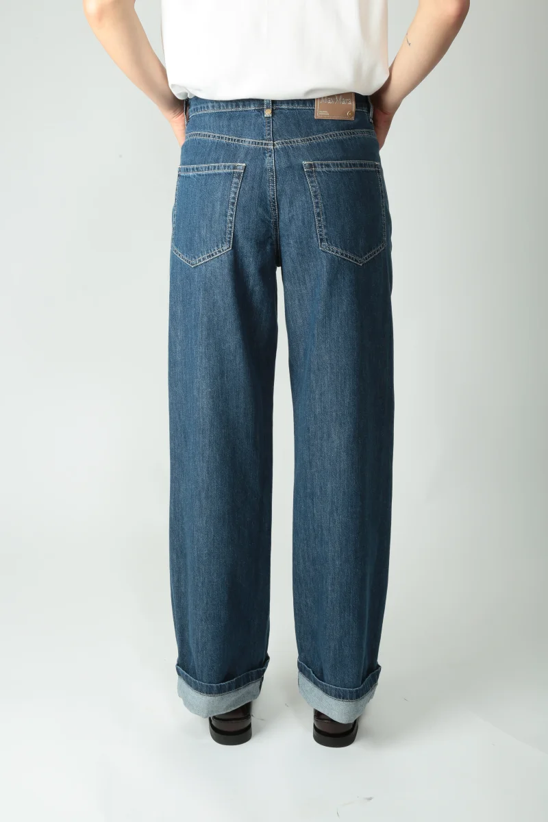 Jeans modello cinque tasche. Vita alta con passanti. Chiusura con zip e bottone. Gamba ampia che stringe leggermente sul fondo. Lavaggio blu scuro. Etichetta personalizzata in vita nella parte posteriore. Piccolo risvolto sul fondo. Capo realizzato in cotone e kapok. Il kapok è un materiale ultraleggero, dovuto alla sua conformazione cava. Inoltre il jeans è realizzato per oltre il 50% da cotone di origina biologica.