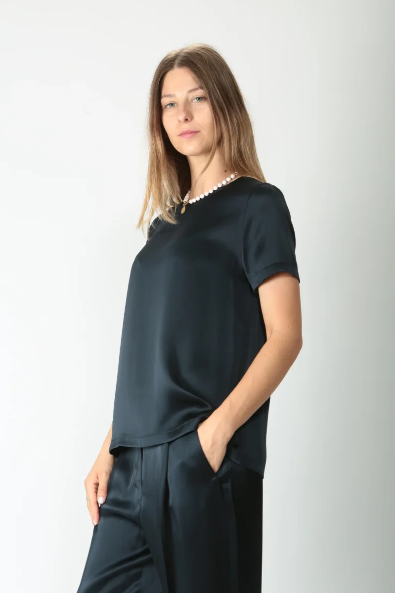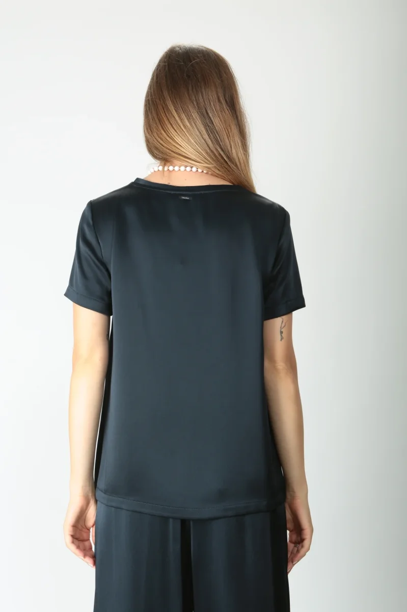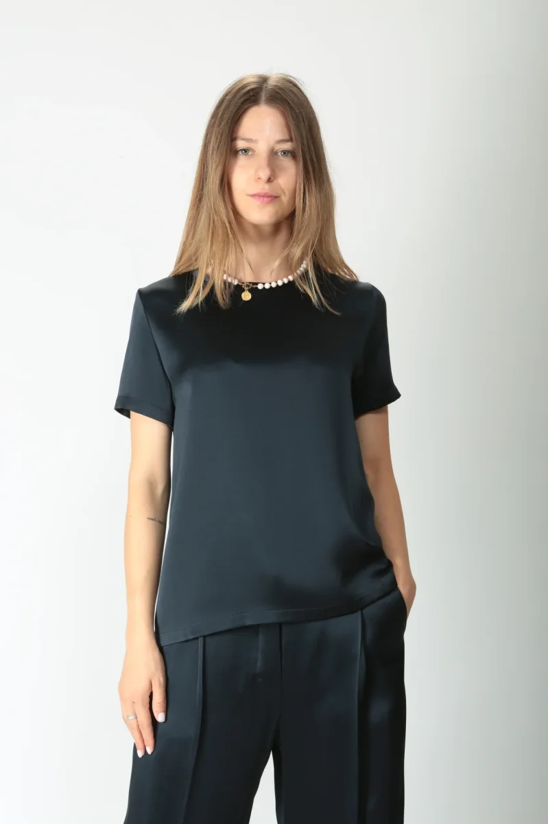T-shirt girocollo in elegante raso di misto viscosa. Modello con maniche corte. Volume fluido. Disponibile anche nel colore avorio.