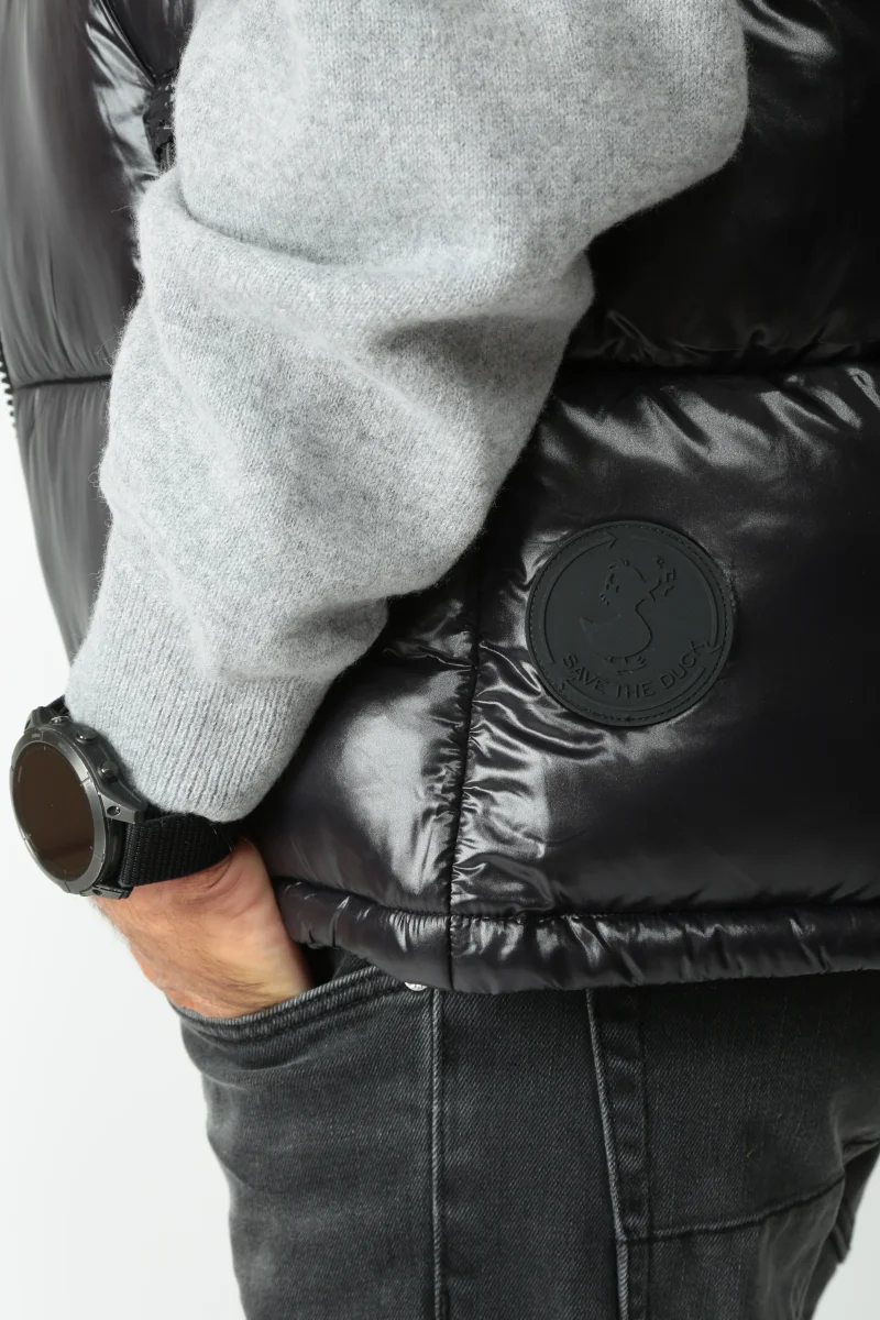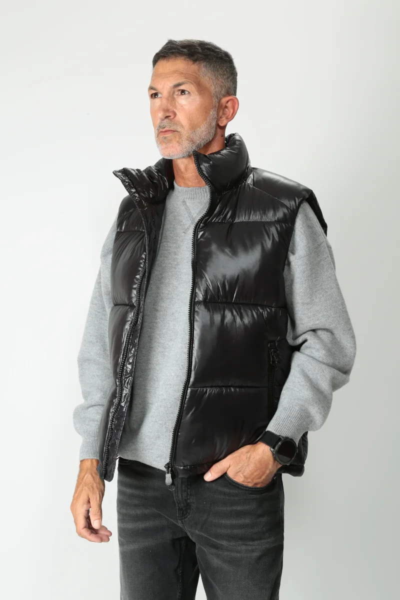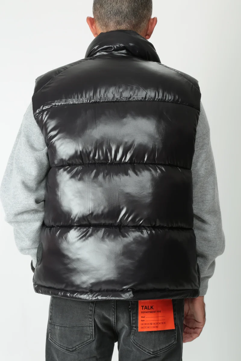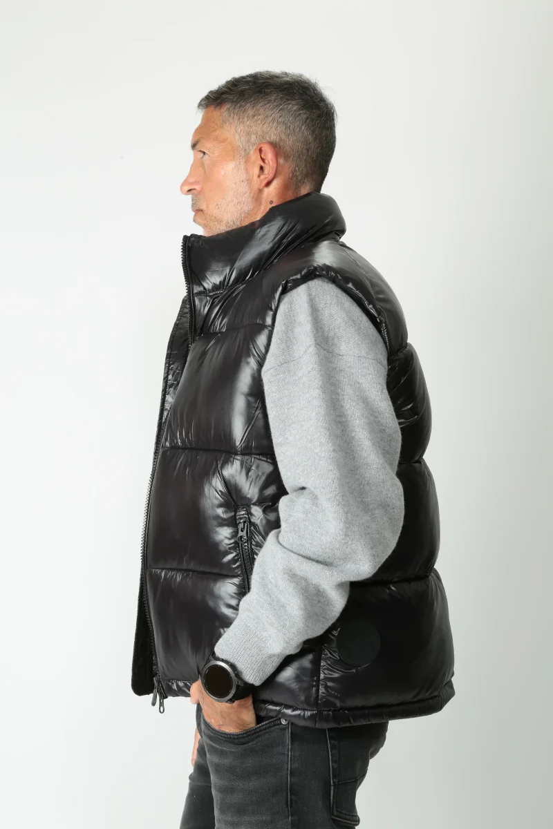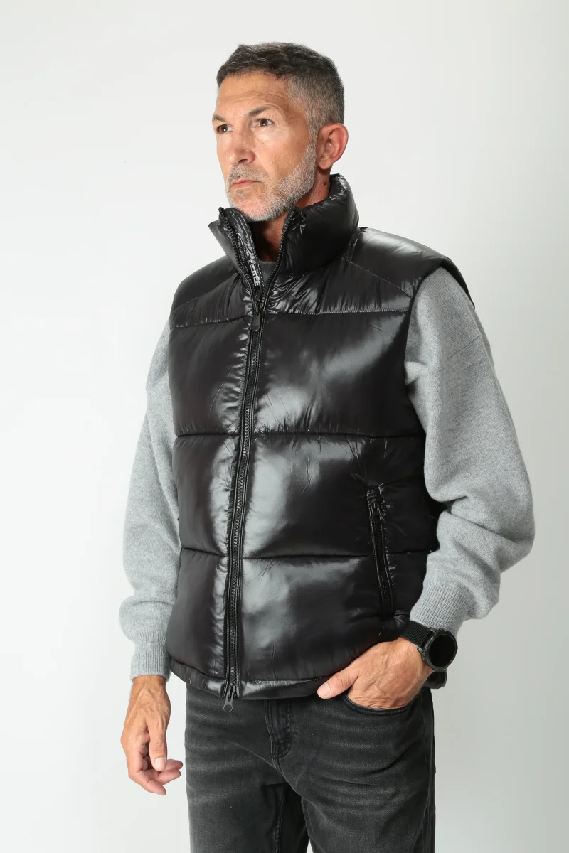 Gilet antipioggia traspirante in nylon lucido. Collo rialzato. Chiusura con zip doppio cursore. Tasche con zip. Coulisse interna sul fondo. Disponibile anche nel colore arancione.