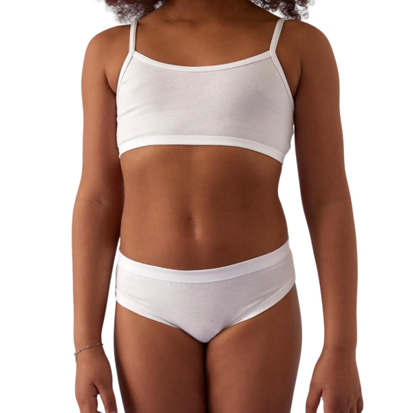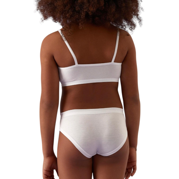 Slip bambina in cotone modal morbido e traspirante, con tassello interno in cotone per igiene e comfort quotidiano. Vestibilità naturale e delicata.