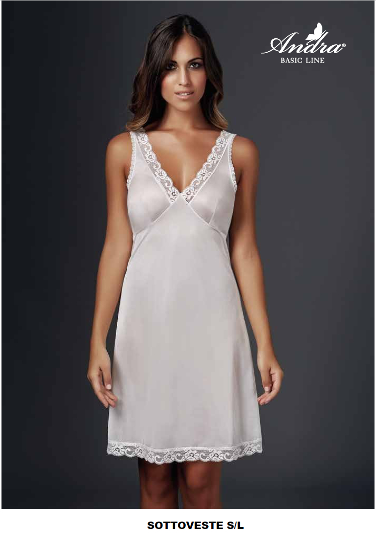 Sottoveste Andra a spalla larga e scollo a V. Delicate bordure in pizzo. Composizione: PA100
