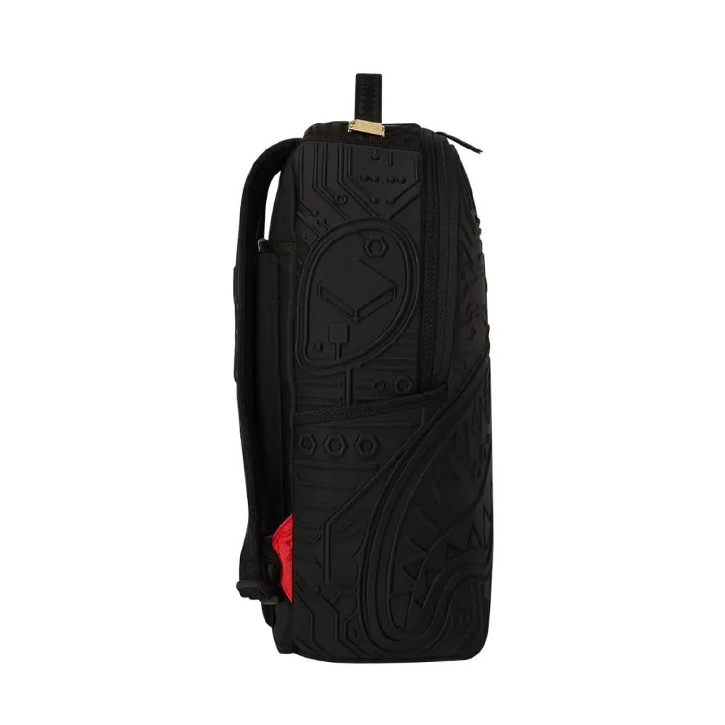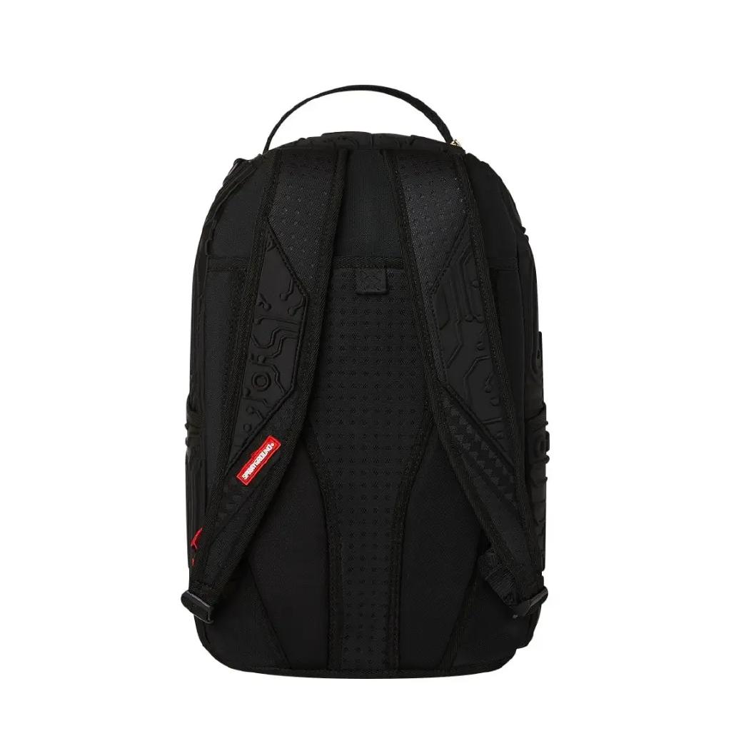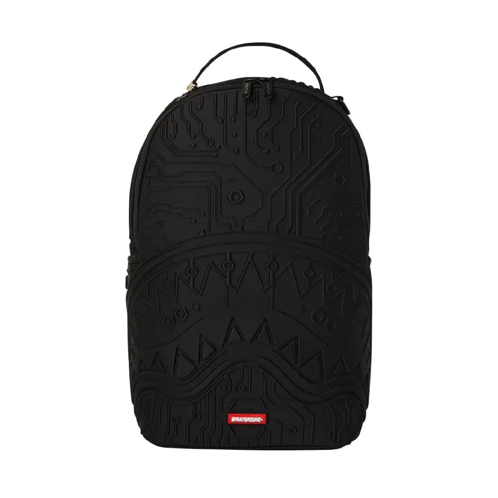 Lo zaino Sprayground presenta il suo iconico motivo con i denti di squalo su un tessuto resistente nera con dettagli in rilievo,