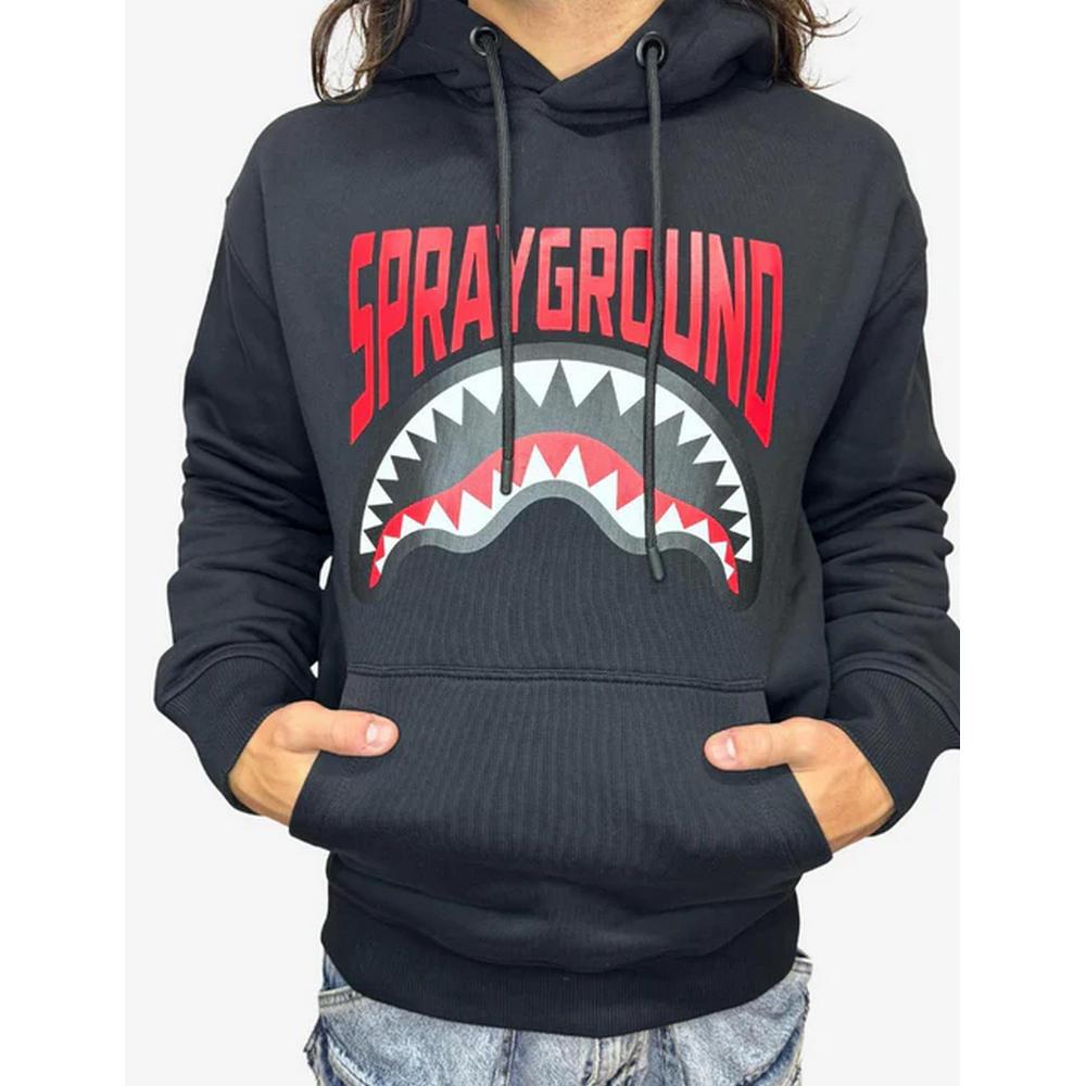 Felpa SPRAYGROUND. Presenta l’iconico logo shark e scritta logata frontalmente. Caratterizzata dal cappuccio con laccio e tasca frontale. Sul lato sinistro è presente l’etichetta logata e gommata in rilievo. I polsini e il fondo sono elasticizzati. L’interno è felpato.