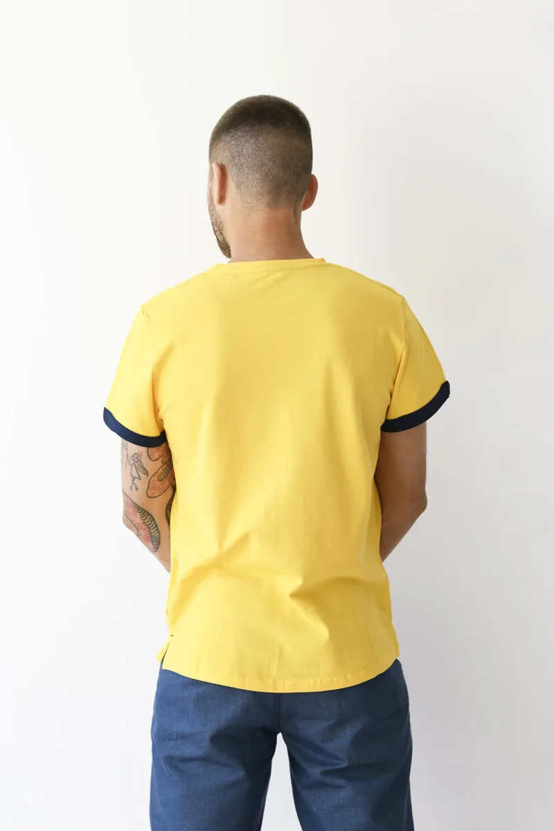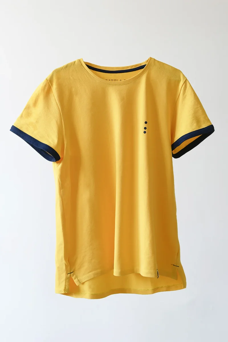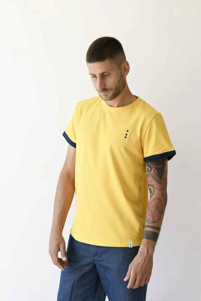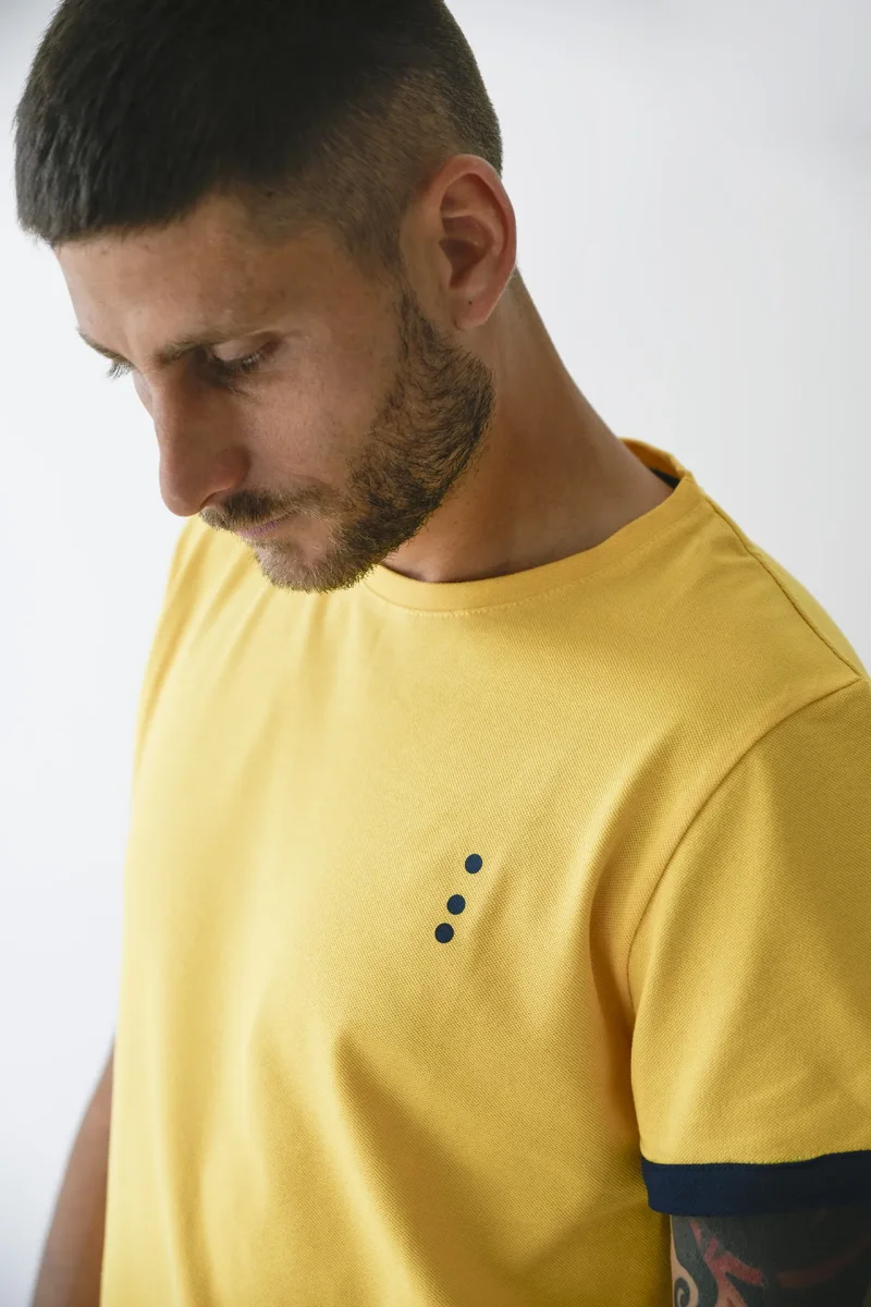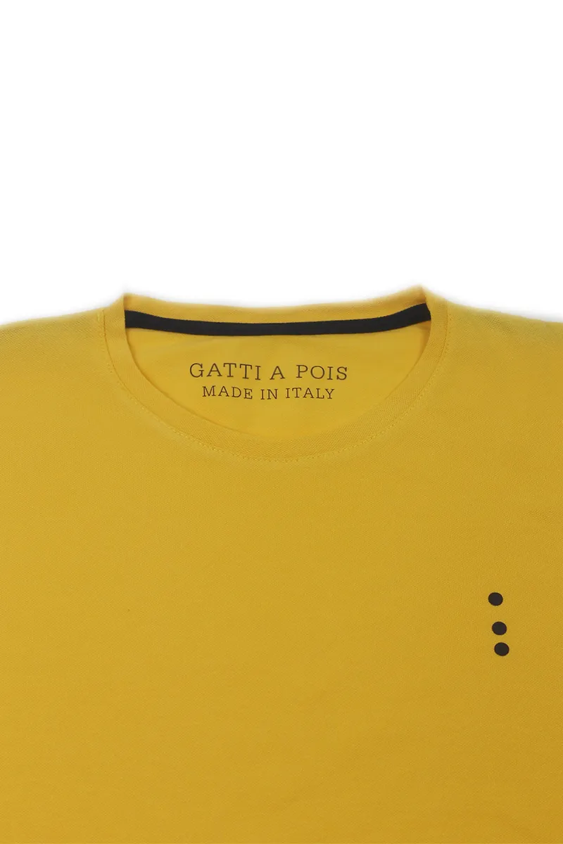La Lavorazione del Tessuto Piquet, dona morbidezza al capo oltre che Eleganza. Il Tessuto e’ realizzato con cotone di altissima qualità e molto resistente al tempo e ai lavaggi. Per evitare fastidi sul collo, Gatti a Pois ha optato per la Serigrafia ad acqua in sostituzione della Classica etichetta sul retro. Cucito sul bordino in basso a sinistra, c’è il cavallotto anch’esso in Cotone di Gatti a Pois. FANTASIA: Monocolore con logo e maniche a contrasto COLORE: Giallo Mais e bordini Blu Notte MATERIALE: Puro Cotone italiano lavorazione Piquet TIPOLOGIA: T-shirt Sartoriale manica corta, lavorazione micropiquet COMPOSIZIONE: 100% COTONE ITALIANO…