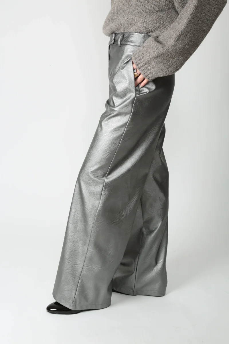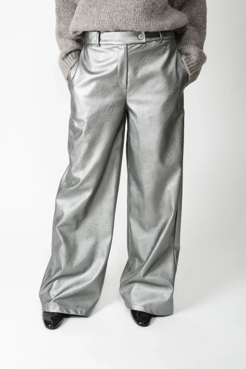 Pantalone in ecopelle. Vita con passanti. Chiusura con bottone spostato e zip. Tasche a filetto sul fianco e nella parte posteriore. Gamba ampia e lunga.