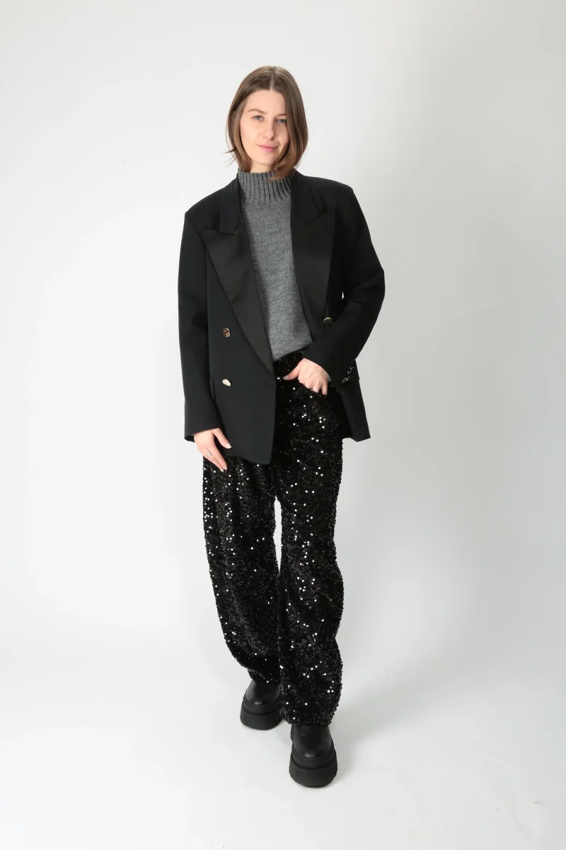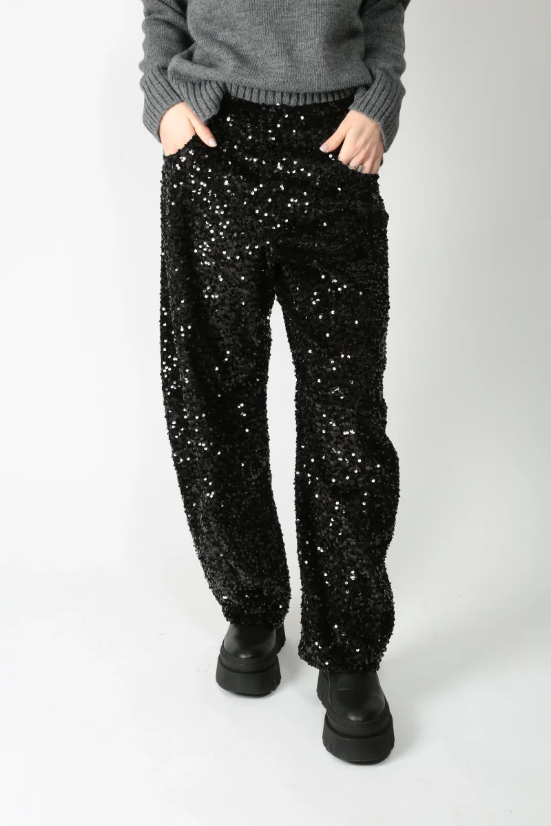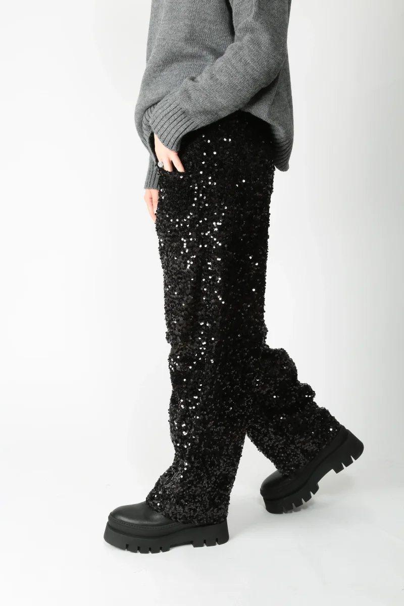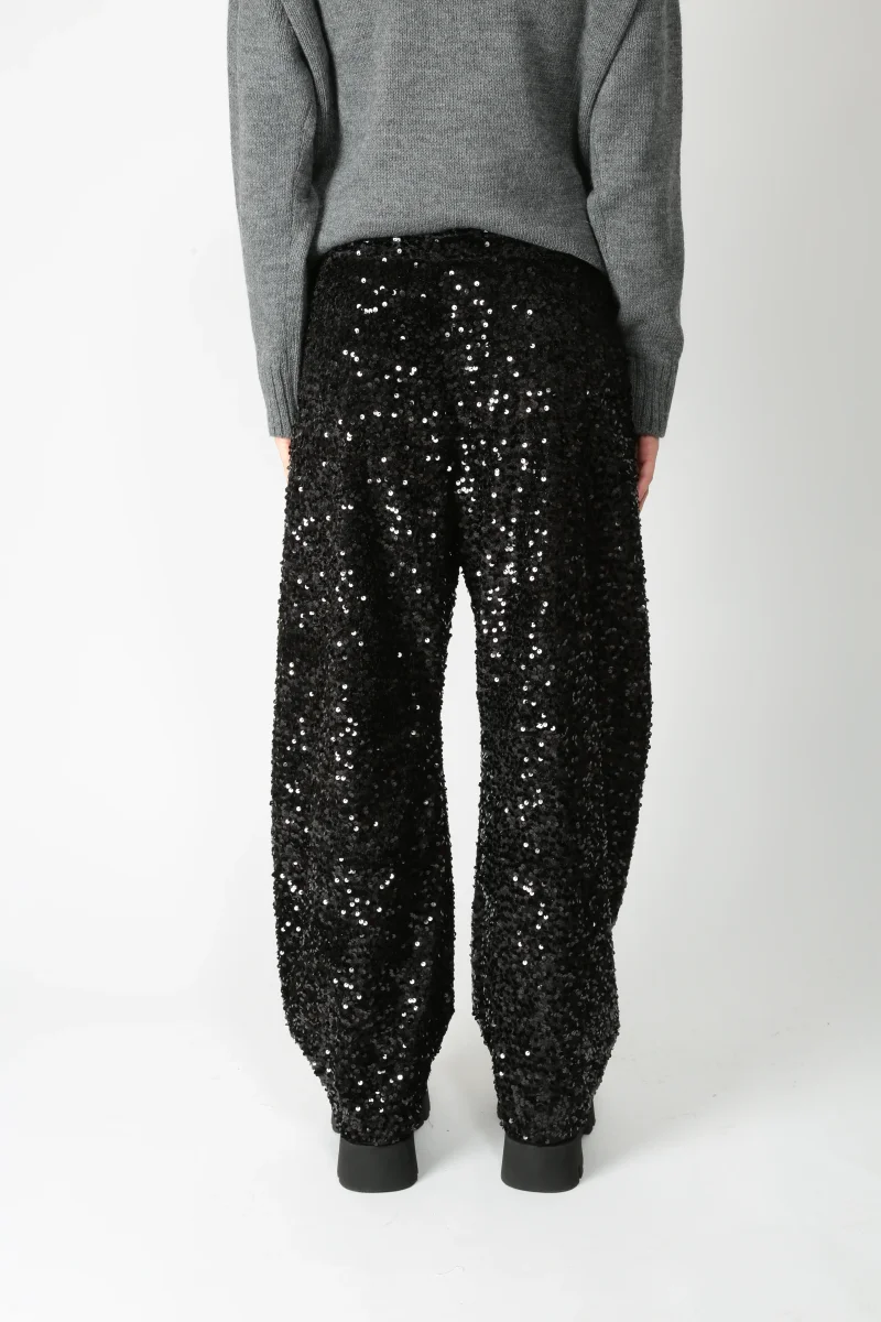 Pantalone in paillettes. Chiusura con bottone ricoperto in paillettes e zip. Tasche modello jeans. Gamba morbida che si stringe sul fondo. Foderato. Disponibile anche nel colore marrone.