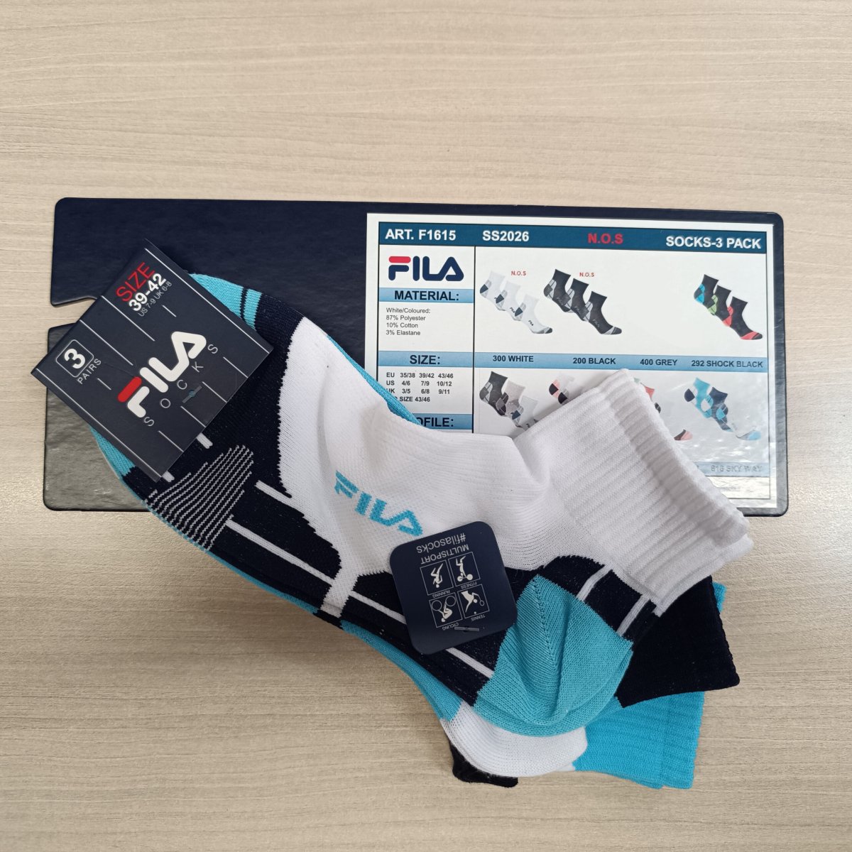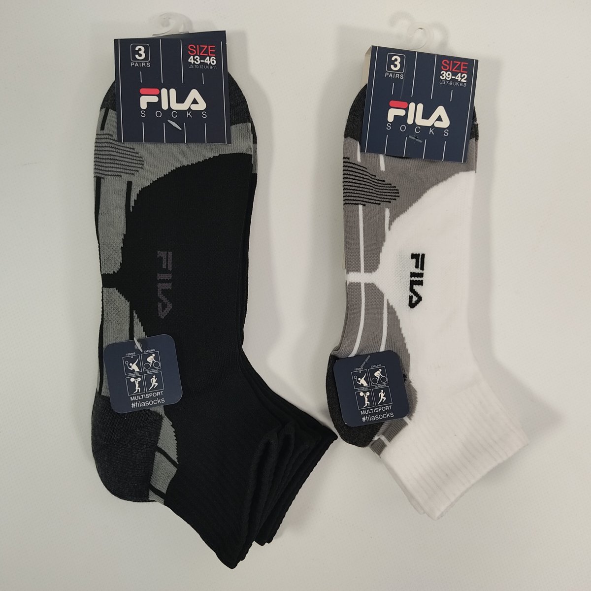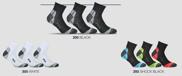 Tris calzino quarter uomo in confezione tutto bianco , tutto nero o con colori fluo . Adatto per lo sport come il ciclismo e la corsa. Filato di microfibra con il 10% di cotone Composizione: PL87 CO10 EA3