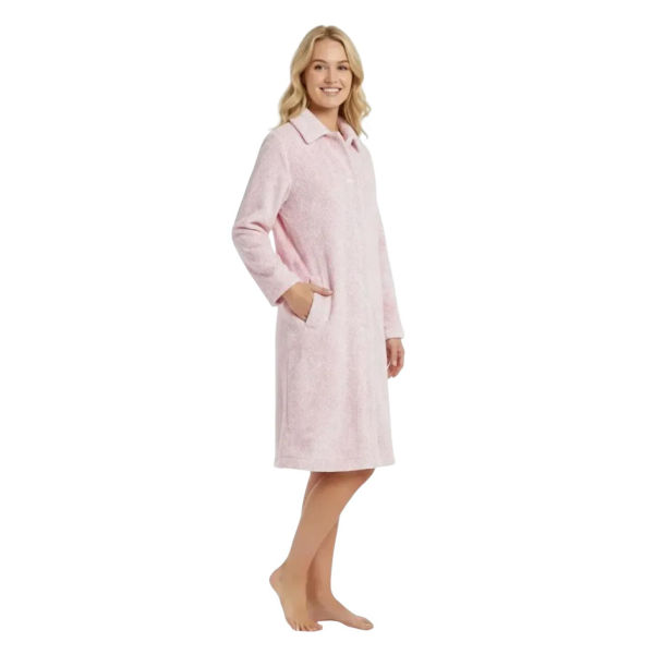 Realizzata in raffinato tessuto spigato a spina di pesce, la vestaglia donna abbottonata si distingue per una texture delicata e ricercata. Il motivo spigato valorizza il design rendendolo elegante ma allo stesso tempo versatile. Per questo motivo è perfetta sia al mattino sia durante le serate più tranquille in casa.