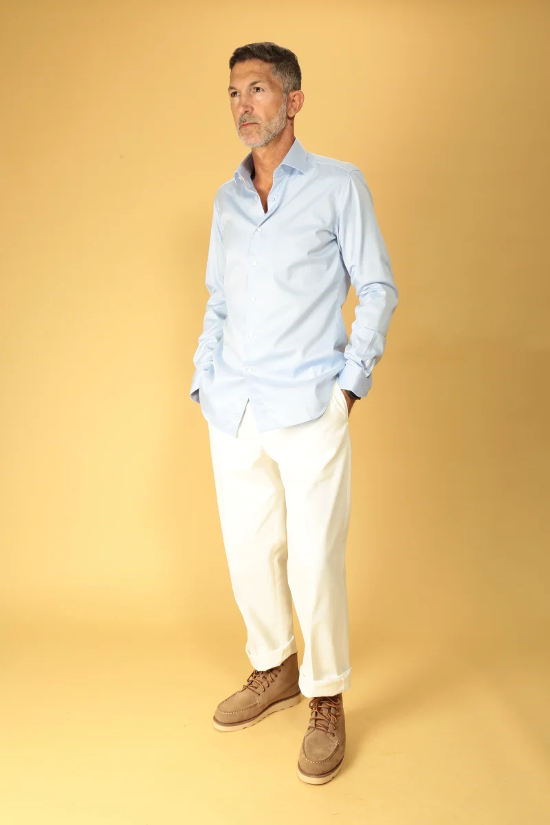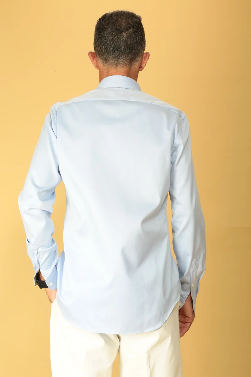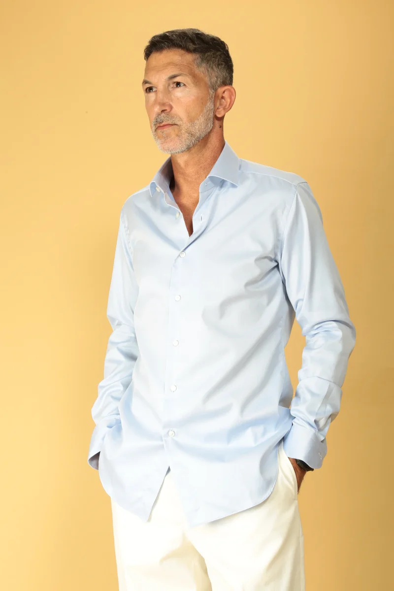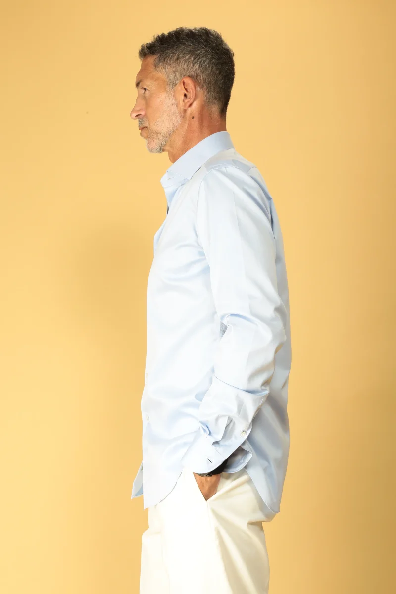 Camicia modello classico realizzata in cotone dalle alte performance che permette di essere indossata senza che si formino pieghe durante il suo utilizzo. Collo alla francese. Chiusura con bottoni. Manica lunga con polso chiuso da due bottoni. Disponibile nel colore bianco e blu.