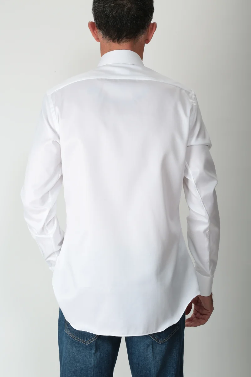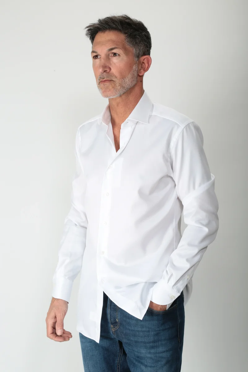 Camicia modello classico realizzata in cotone dalle alte performance che permette di essere indossata senza che si formino pieghe durante il suo utilizzo. Collo alla francese. Chiusura con bottoni. Manica lunga con polso chiuso da due bottoni. Disponibile anche nel colore azzurro.